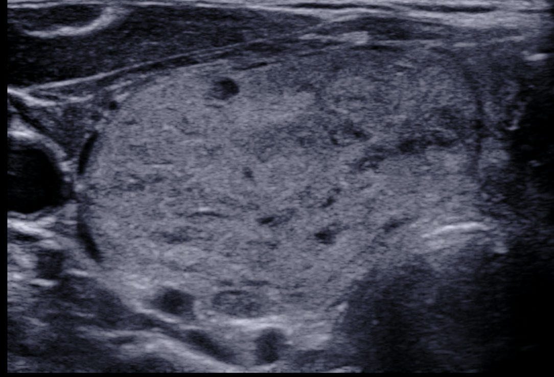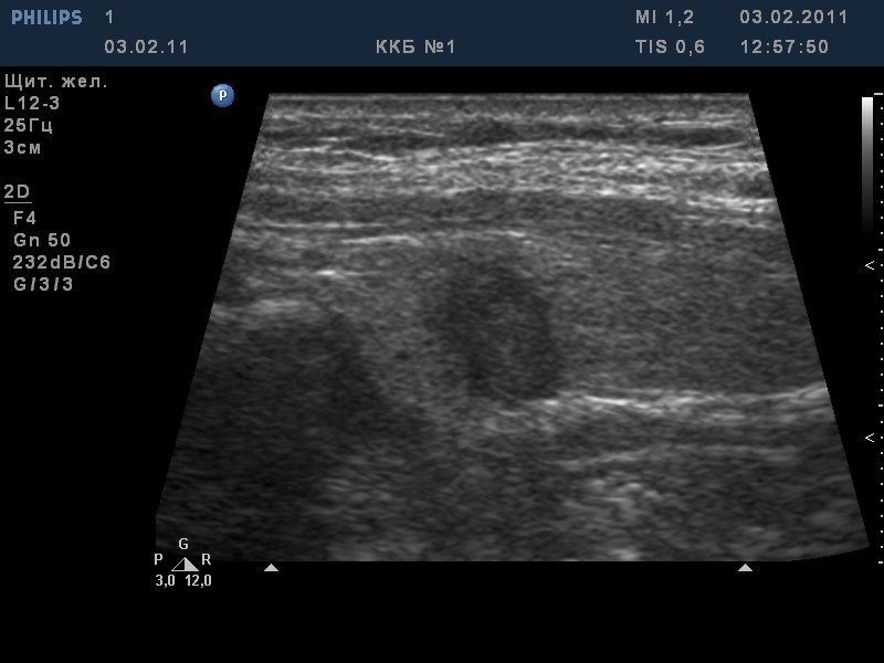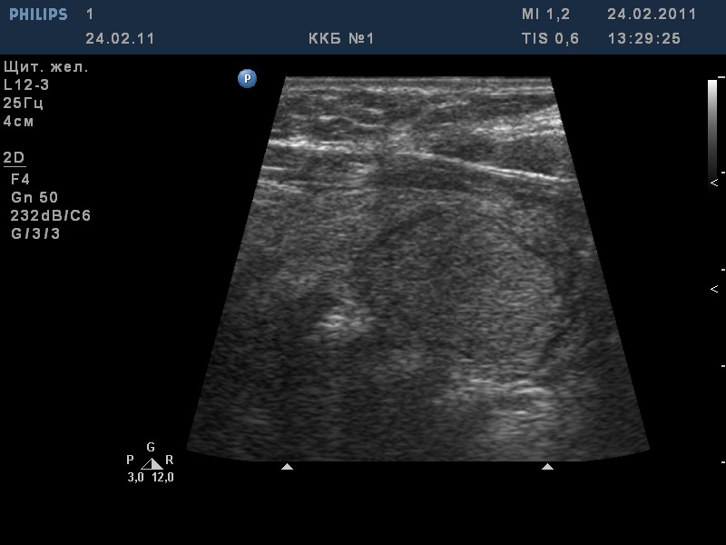 • солидные узлы, равномерно или неравномерно умеренно пониженной эхогенности;