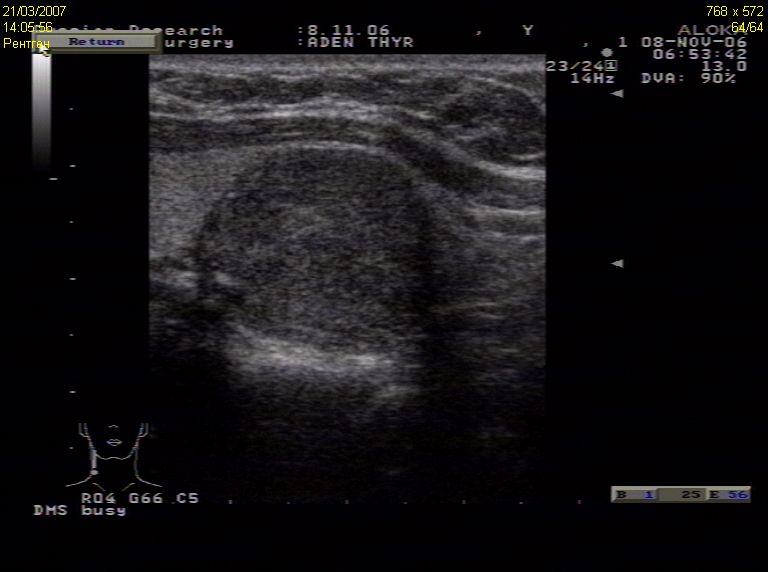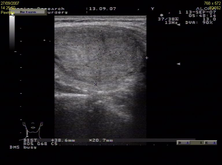 – умеренное снижение эхогенности или неравномерная эхогенность узла (наличие гипоэхогенных включений);