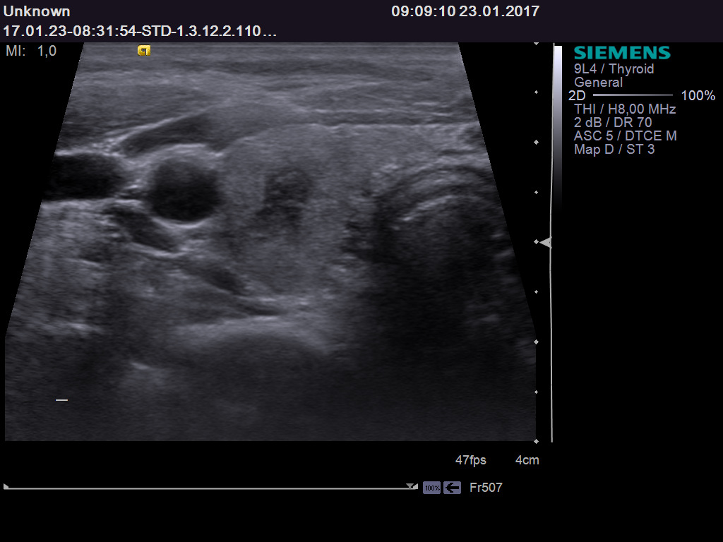 При наличии измененных лимфатических узлов (шаровидная форма, исчезновение дифференцировки внутренних структур, кистозные изменения, кальцинаты) к указанию категории ТI-RADS целесообразно в заключении добавлять “ЛИМФАДЕНОПАТИЯ”. На основании заключения ультразвукового исследования и клинико-лабораторных данных врач-эндокринолог принимает окончательное решение о необходимости выполнения пункционной биопсии узла ЩЖ и измененных лимфатических узлов шеи.