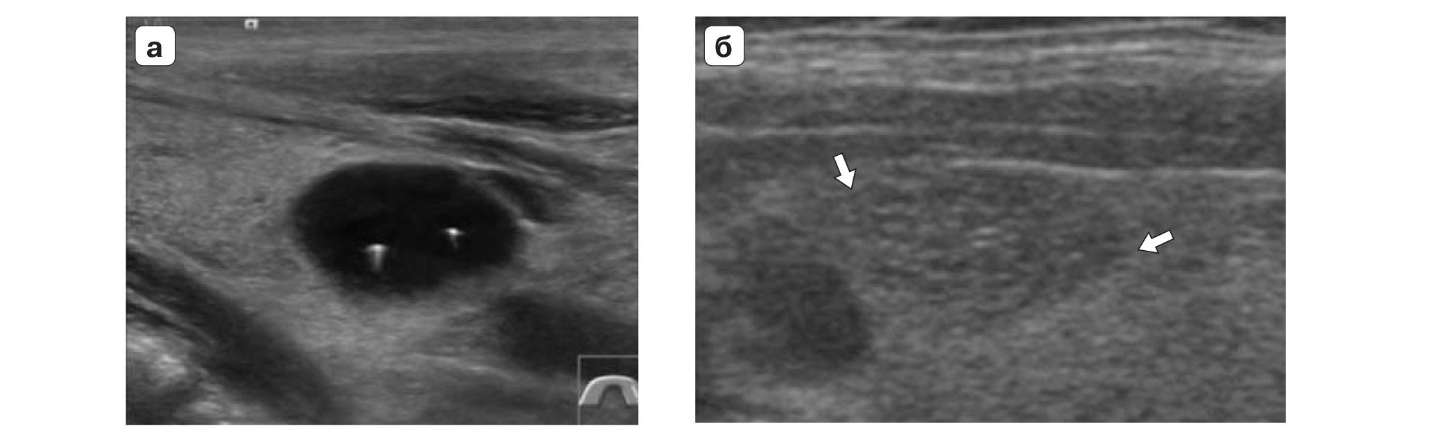 Рис. 1. Категория TI-RADS 2: а – кистозно расширенный или макрофолликул; б – губчатый узел (стрелки).