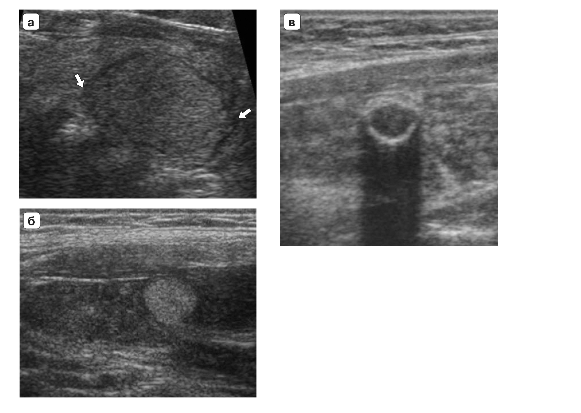 Рис. 2. Категория TI-RADS 3: а – изоэхогенный очаг (стрелки), окруженный тонким хало (узловой зоб); б – гиперэхогенный очаг округлой формы, с четкими контурами, тонким гипоэхогенным ободком на фоне аутоиммунного тиреоидита; в – кальцинированный узел по типу “яичной скорлупы”.