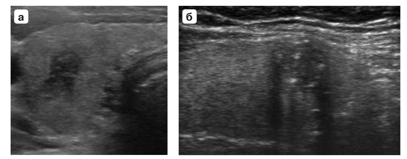 Рис. 5. TI-RADS 5. Узлы ЩЖ размером <1,0 см: а – узел с нечеткими и неровными лучистыми контурами, вертикальной пространственной ориентации, значительно пониженной эхогенности, с микрокальцинатами; б – узел шаровидной формы, с нечеткими, размытыми, неровными микродольчатыми контурами, умеренно пониженной эхогенности, с микрокальцинатами, подрастает к капсуле ЩЖ, деформируя наружный контур доли. Цитологически и гистологичеки во всех представленных узлах диагностирован папиллярный рак.
