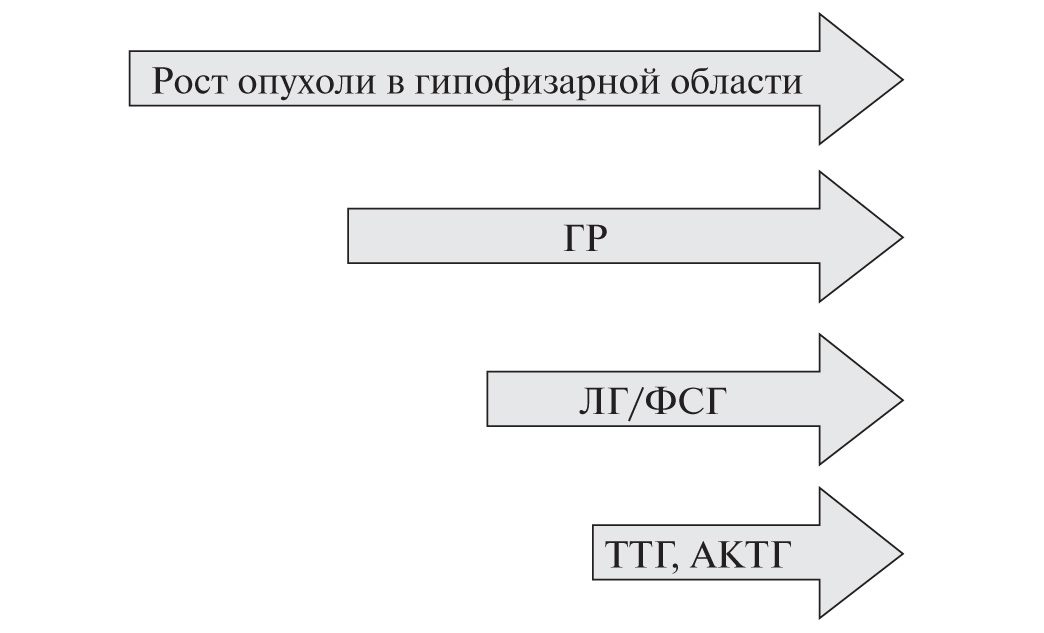 1. Picture. The “classical” sequence of violation of the secretion of pituitary hormones against the background of tumor growth in the pituitary region. | |