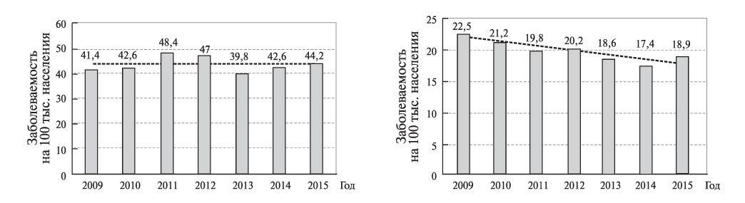 1. Fig. 1. Dynamics of the incidence of endemic and other forms of non-toxic goiter in children from 0 to 14 years old (left graph) and adolescents 15-17 years old (right graph) in Russia from 2009 to 2015 [4].