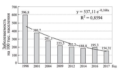 2. Fig. 2. Indicators of the primary incidence (new cases per 100 thousand people) of diffuse non-toxic goiter in children 0–14 years old in Belarus from 1998 to 2017 [5].