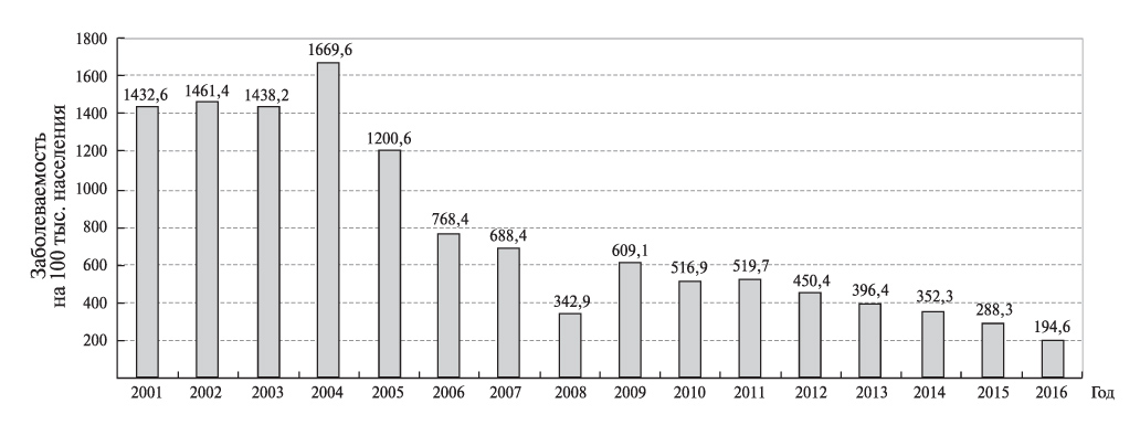 3. Fig. 3. The dynamics of the incidence of endemic goiter in the population of Kyrgyzstan from 2001 to 2016 [6].