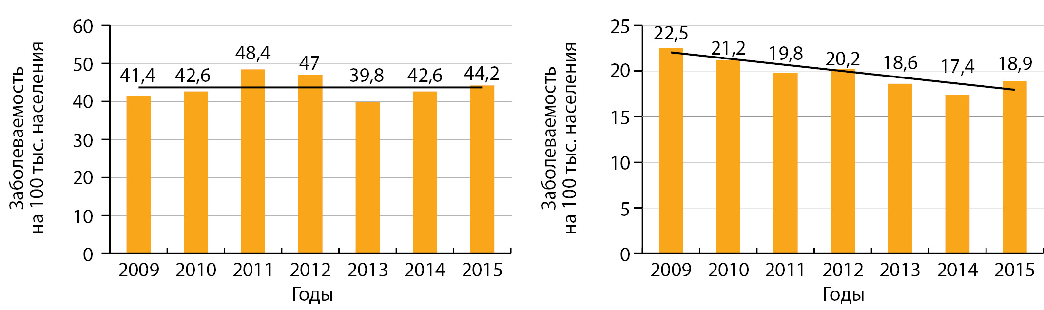 2. Рис. 2. Динамика заболеваемости эндемическим и другими формами нетоксического зоба у детей (левый график) и подростков (правый график) в Российской Федерации с 2009 по 2015 гг. [9].