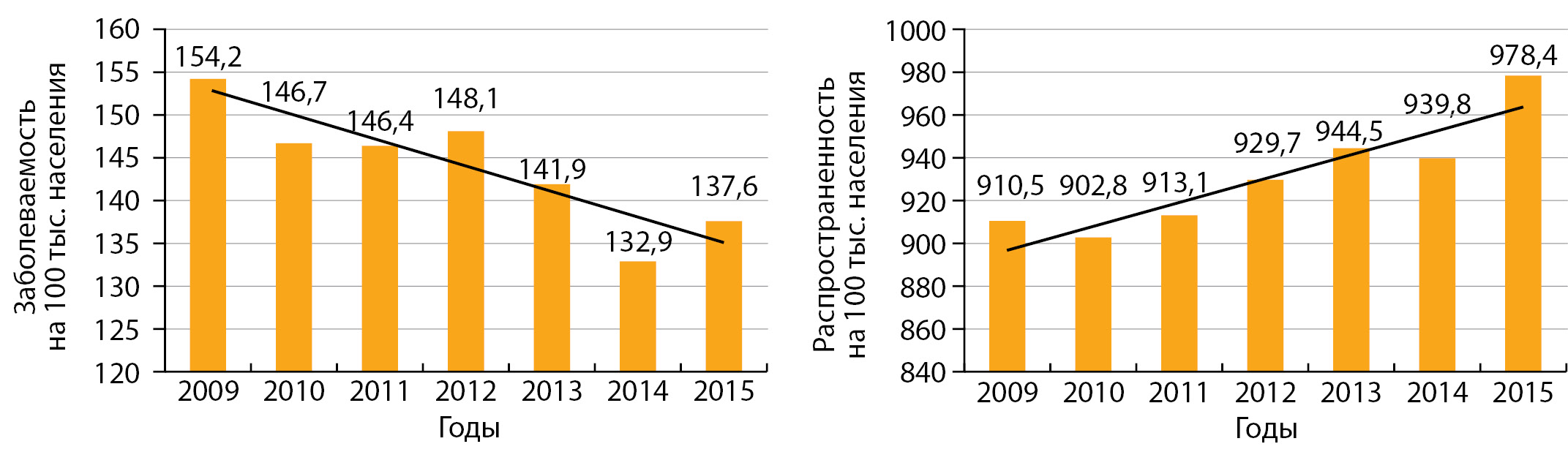 3. Рис. 3. Динамика заболеваемости (левый график) и распространенности (правый график) эндемическим и другими формами нетоксического зоба у взрослых лиц в Российской Федерации с 2009 по 2015 гг. [9].