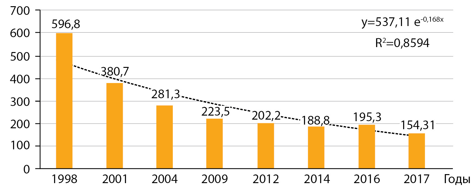 4. Рис. 4. Динамика заболеваемости диффузным зобом (E01.0 и Е04.0) у детей и подростков в Республике Беларусь за период с 1998 по 2017 гг. [10].