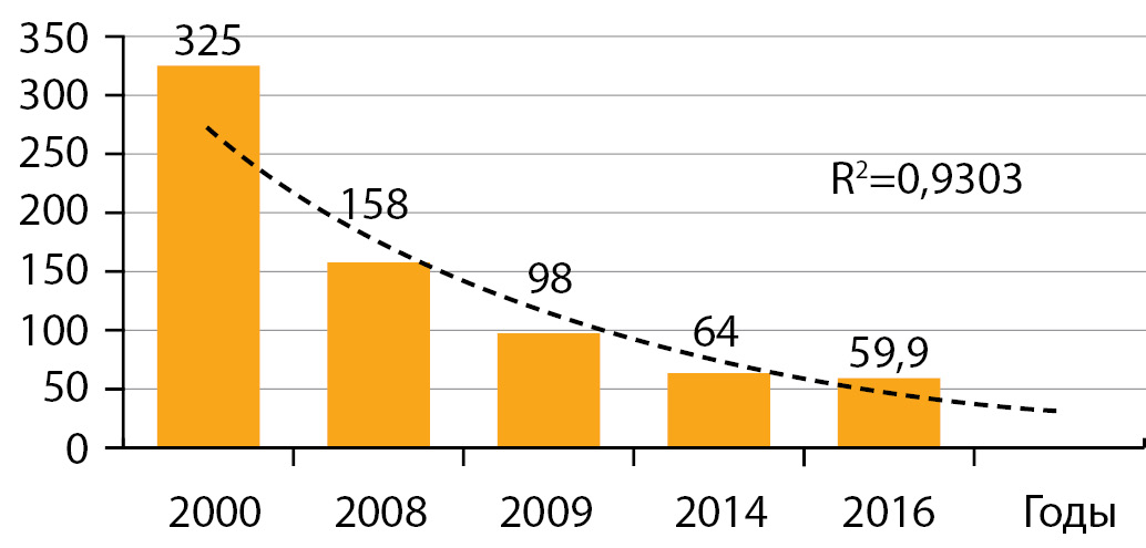 5. Рис. 5. Динамика заболеваемости диффузным зобом (E01.0 и Е04.0) у взрослых лиц за период с 2000 по 2016 гг. в Республике Беларусь [11].
