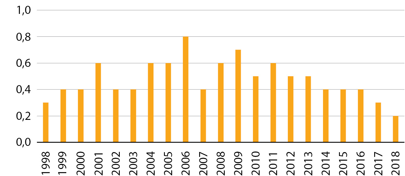 6. Рис. 6. Заболеваемость (случаи на 100 тыс. населения) другими формами нетоксического зоба (Е04) у детей и подростков (0–19 лет) в Швеции с 1998 по 2018 гг. [13].