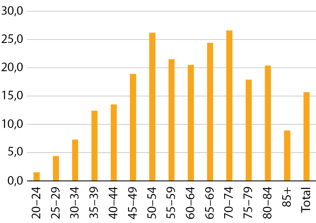 7. Рис. 7. Заболеваемость (случаи на 100 тыс. населения) другими формами нетоксического зоба (Е04) у взрослых лиц (от 20 до 85 и более лет) в Швеции в 2016 гг.