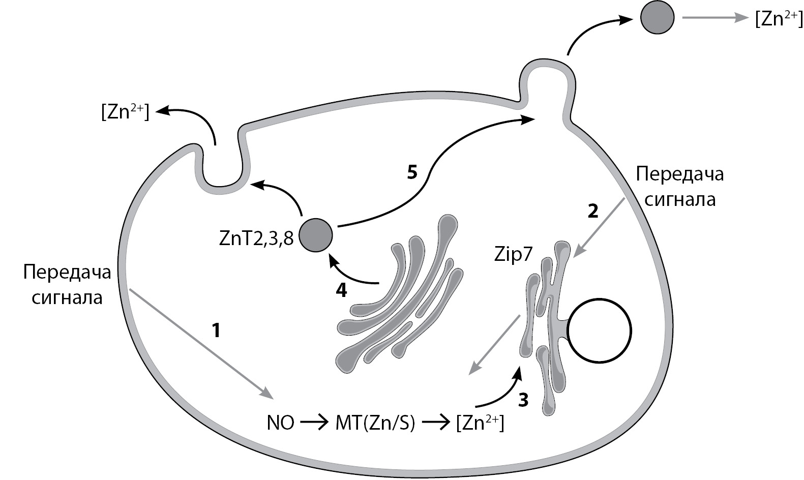 1. Рис. 1. Упрощенные пути клеточного распределения ионов цинка (Zn2+), компартментализации и передачи сигналов. (1) Внеклеточные сигналы генерируют реактивные частицы (NO, пероксид), которые реагируют с координационной средой цинка/тиолата (Zn/S) в металлотионеинах (MT) и высвобождают ионы цинка (Zn2+) в качестве эффекторов клеточных мишеней. (2) Внеклеточные сигналы также стимулируют переносчик цинка Zip7 на мембране эндоплазматического ретикулума (ЭПР) и увеличивают пул клеточных ионов цинка (Zn2+). Ионы цинка (Zn2+) транспортируются в ЭПР (3) или в аппарат Гольджи, которые формируют экзовезикулы (4) для внеклеточных мишеней или везикулы, которые отделяются от плазматической мембраны с образованием везикул внеклеточного матрикса (5) [4]. | |