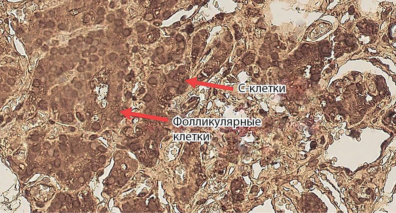 2. Рис. 2. Экспрессия белка ZnT8 в фолликулярных клетках щитовидной железы и С-клетках. Magn 400. (адаптировано из Bossowski A, Stożek K, Rydzewska M, et al. Expression of zinc transporter 8 in thyroid tissues from patients with immune and non immune thyroid diseases. Autoimmunity. 2020 Nov;53(7):376-384. doi: 10.1080/08916934.2020.1815194). | |