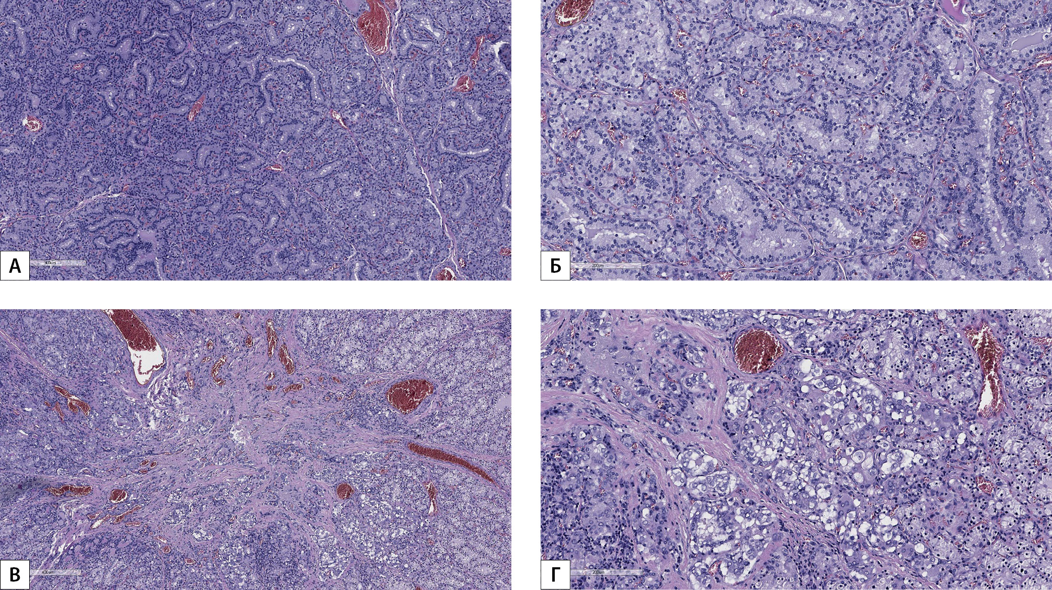 В ходе текущей госпитализации принято решение о порядке последующих лечебных мероприятий — признано целесообразным проведение в первую очередь тиреоидэктомии, после чего — повторной трансназальной аденомэктомии. Экстрафасциальная тиреоидэктомия выполнена в декабре 2021 г., послеоперационный период — без особенностей. При плановом морфологическом исследовании операционного материала ткань щитовидной железы представлена мелкими фолликулами неправильной формы со скудным коллоидом с вакуолями резорбции; фолликулярный эпителий гиперплазирован, тироциты с обильной светлой и светлой эозинофильной цитоплазмой; в строме щитовидной железы отмечаются расширенные полнокровные кровеносные сосуды, очаги лимфоидной инфильтрации с формированием лимфоидных фолликулов с герминативными центрами; на одном из гистологических срезов, в толще левой доли щитовидной железы, среди вышеописанных изменений отмечается рост неинкапсулированной папиллярной микрокарциномы диаметром 0,3 см, фолликулярного строения, без инвазии в капсулу доли щитовидной железы. Заключение: «Папиллярная микрокарцинома левой доли щитовидной железы, pT1aNxMx. Диффузный зоб щитовидной железы». Данные патоморфологического исследования щитовидной железы представлены на рис. 1.