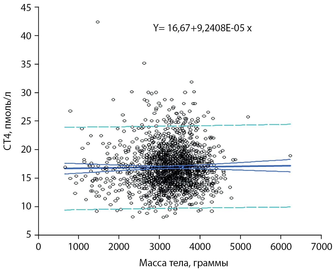 2. Рисунок 2. Зависимость между массой тела при рождении и уровнем св.Т4. Коэффициент наклона b=9,2408E-05 (95% ДИ 1,9186E-04; 3,7667E-04), p=0,524. Синяя толстая линия — линия линейной регрессии, синие тонкие линии — 95% ДИ линии линейной регрессии, штриховые линии ограничивают предсказуемый на 95% интервал регрессии. | |