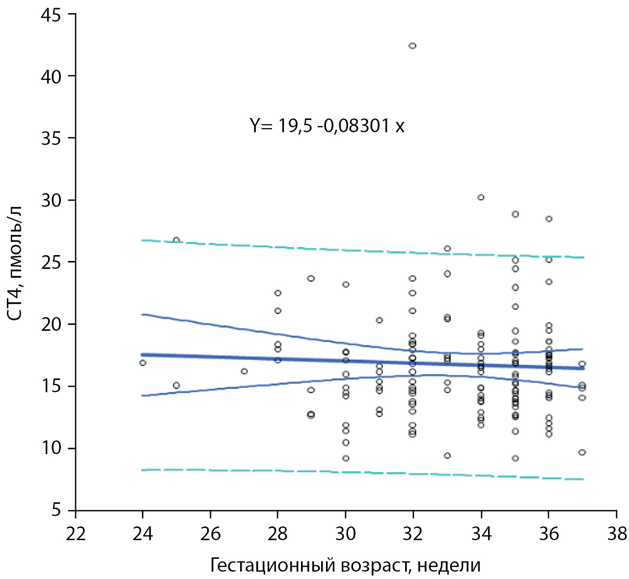 3. Рисунок 3. Зависимость концентрации св.Т4 от гестационного возраста у недоношенных Коэффициент наклона b=-0,08301 (95% ДИ -0,35506; 0,18904), p=0,546. Синяя толстая линия — линия линейной регрессии, синие тонкие линии — 95% ДИ линии линейной регрессии, штриховые линии ограничивают предсказуемый на 95% интервал регрессии. | |