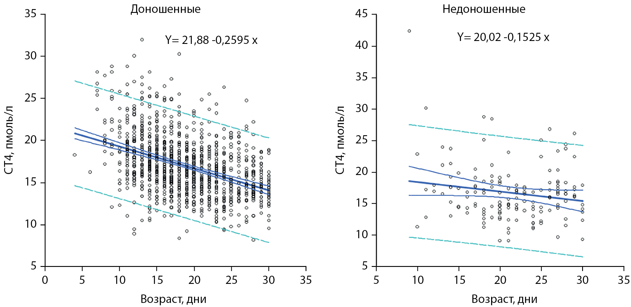 4. Рисунок 4. Зависимость распределения уровня св.Т4 от возраста новорожденных среди доношенных (слева) и недоношенных детей (справа). Для доношенных коэффициент наклона b=-0.2595, p<0,001. Для недоношенных коэффициент наклона b=-0,1525, p<0,001. Синяя толстая линия — линия линейной регрессии, синие тонкие линии — 95% ДИ линии линейной регрессии, штриховые линии ограничивают предсказуемый на 95% интервал регрессии. | |