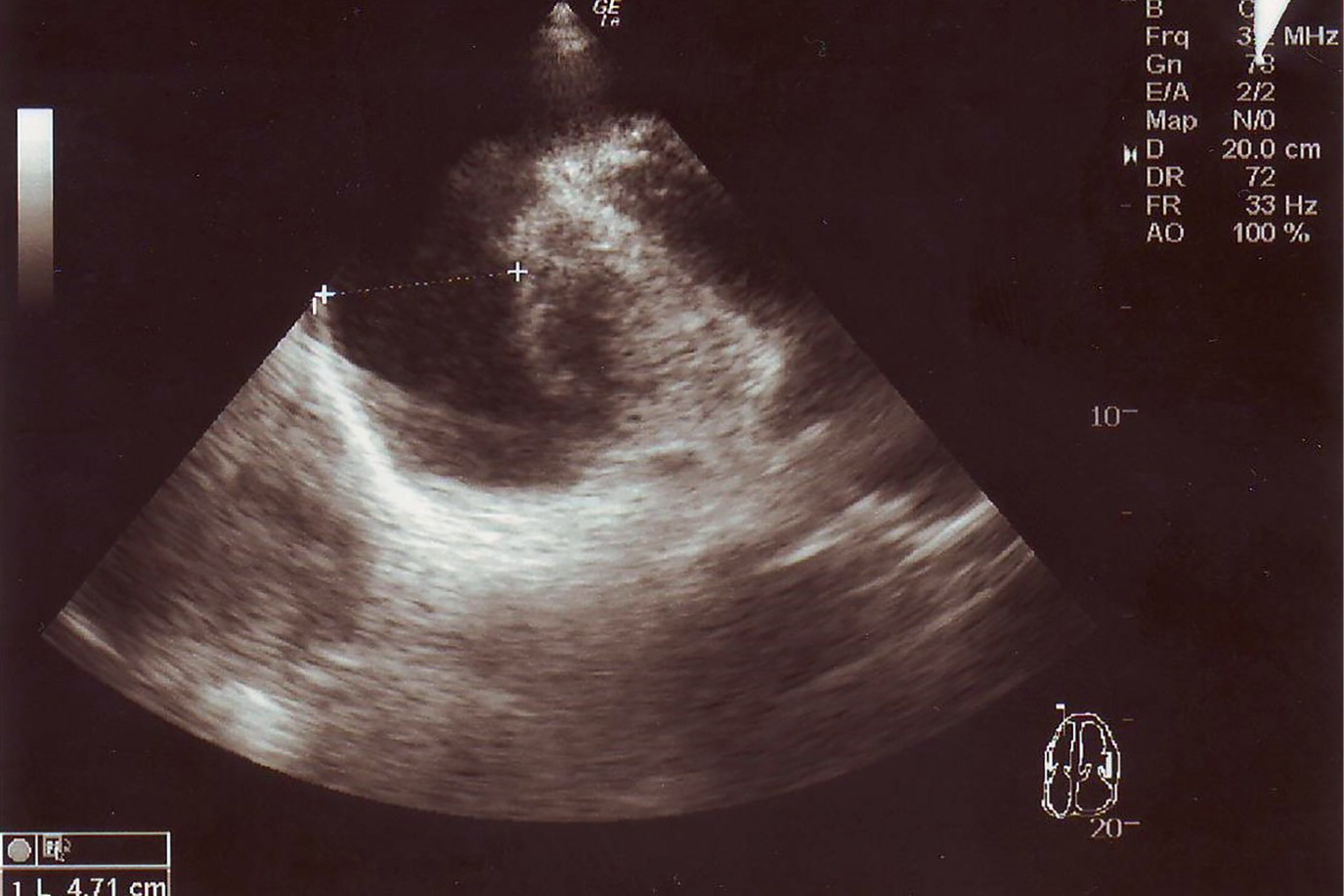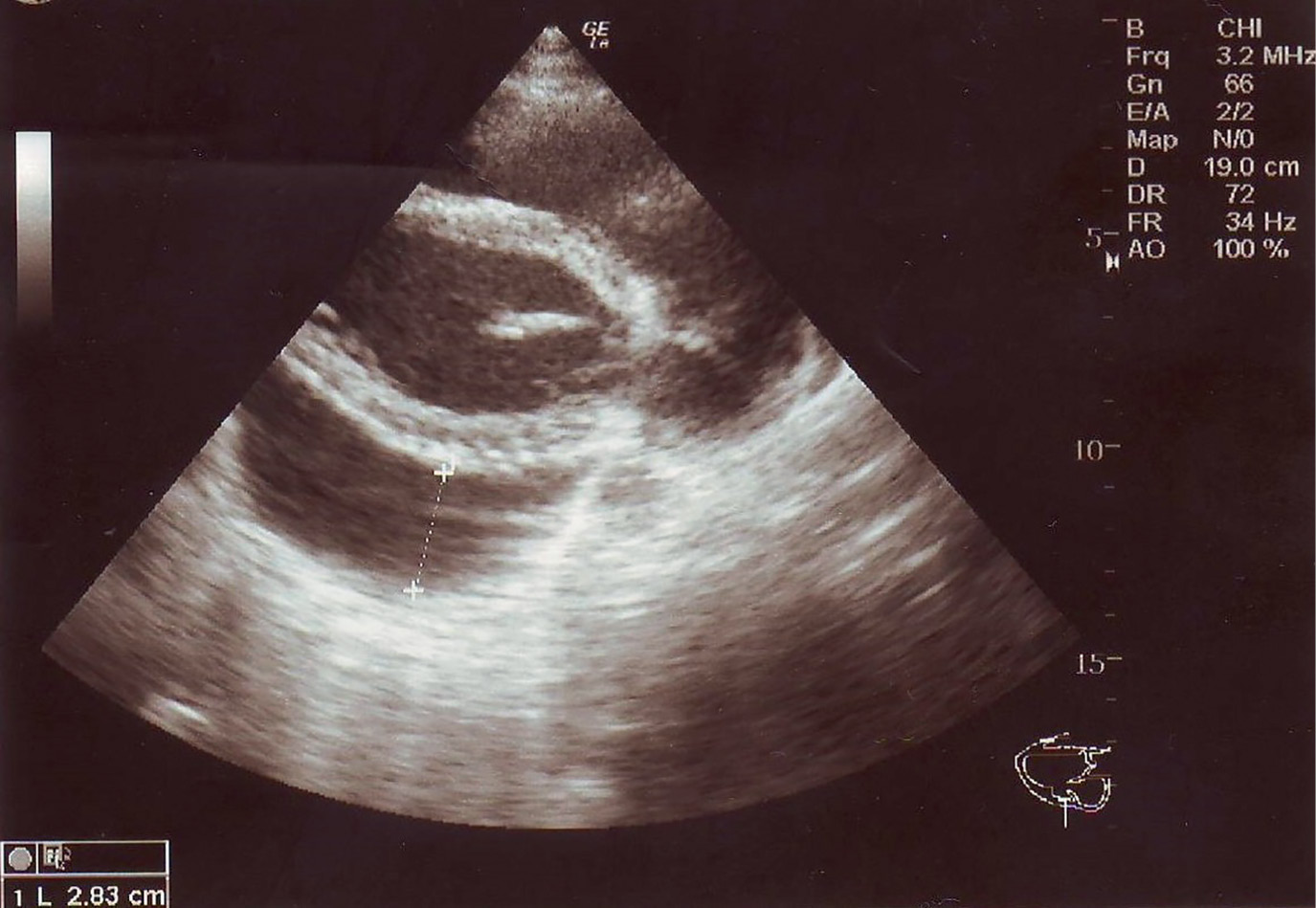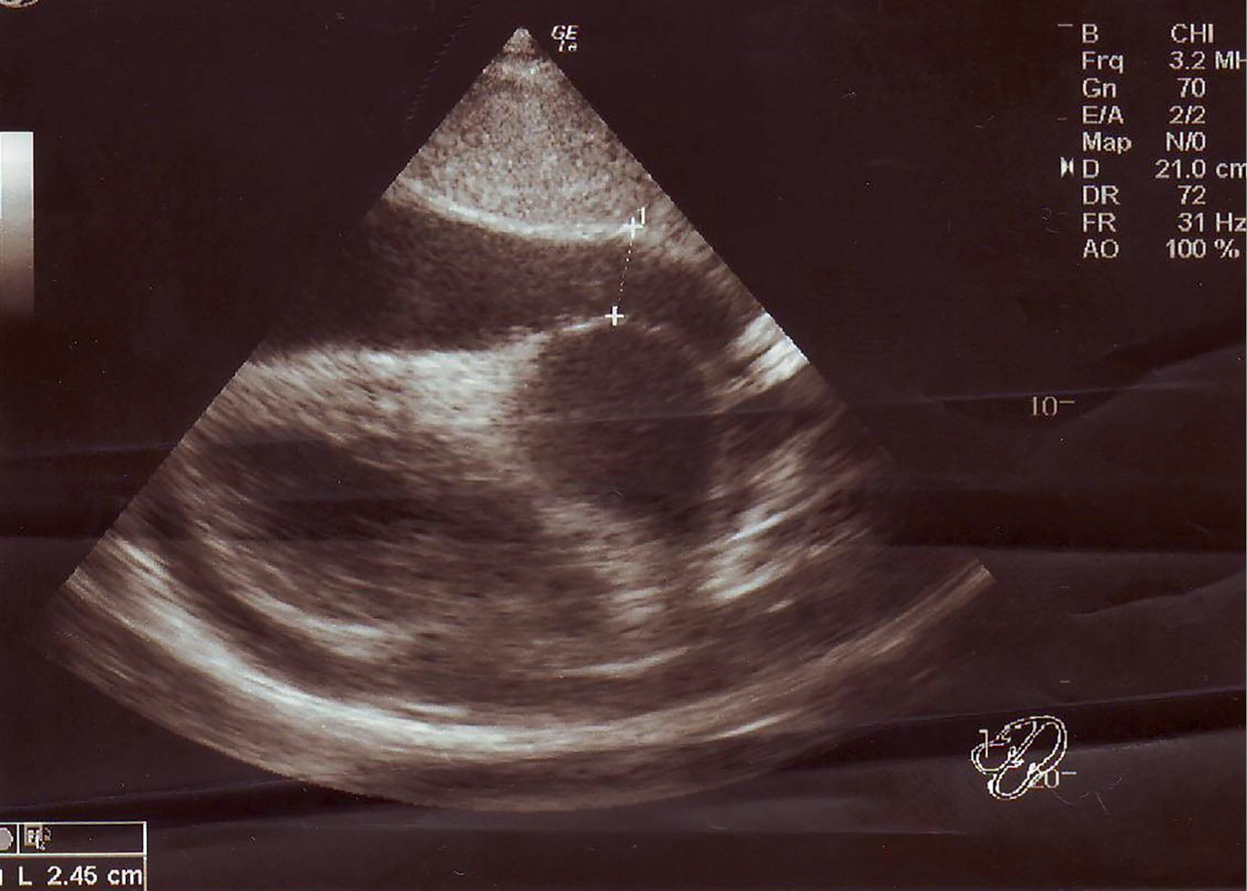 2. Рисунок 2. УЗИ сердца. Гидроперикард в области верхушки. | |