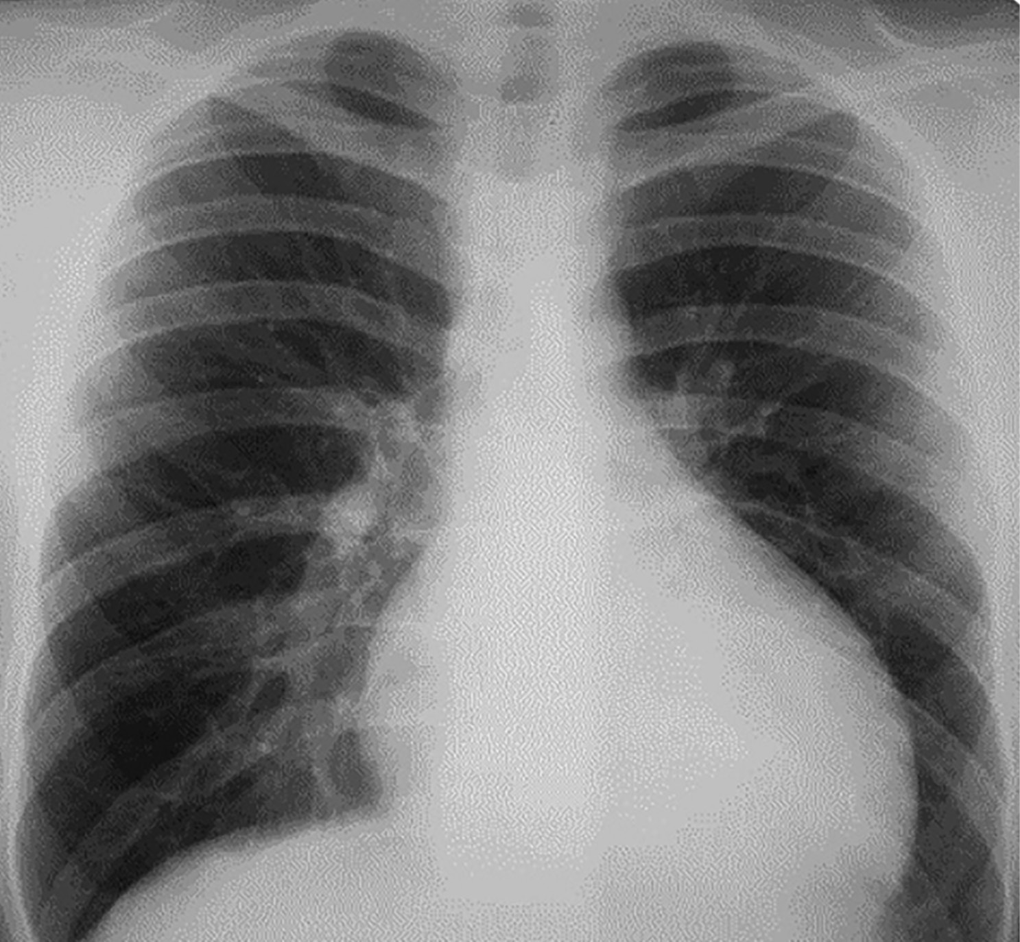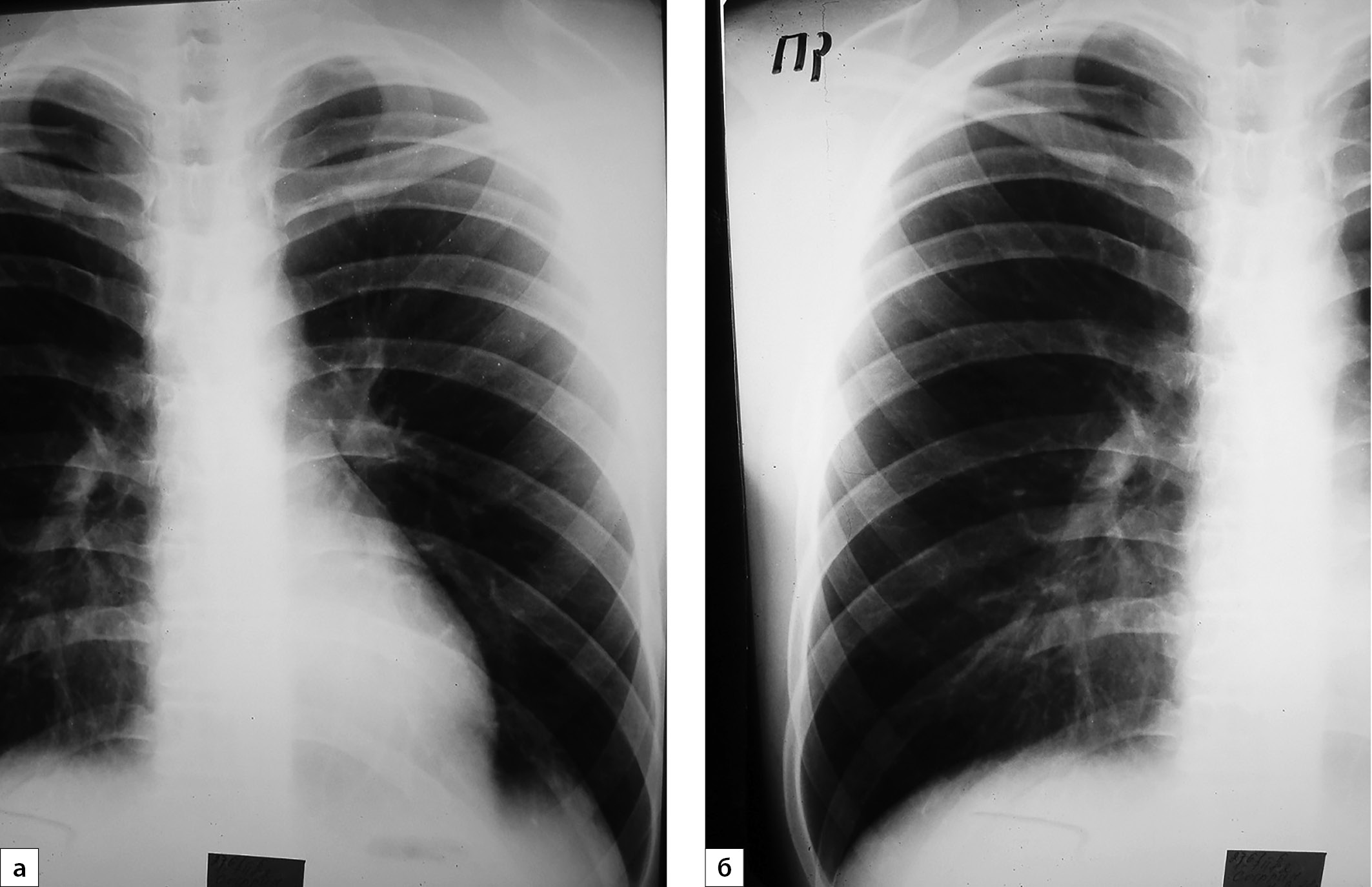 6. Рисунок 6 (а, б). Обзорные рентгенограммы органов грудной клетки в динамике. | |