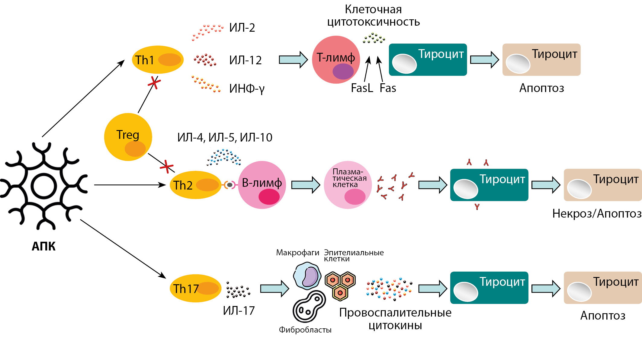 1. Рисунок 1. Механизмы разрушения ткани ЩЖ при АИТ (адапт. European Thyroid Journal 11, 1; 10.1530/ETJ-21-0024).
