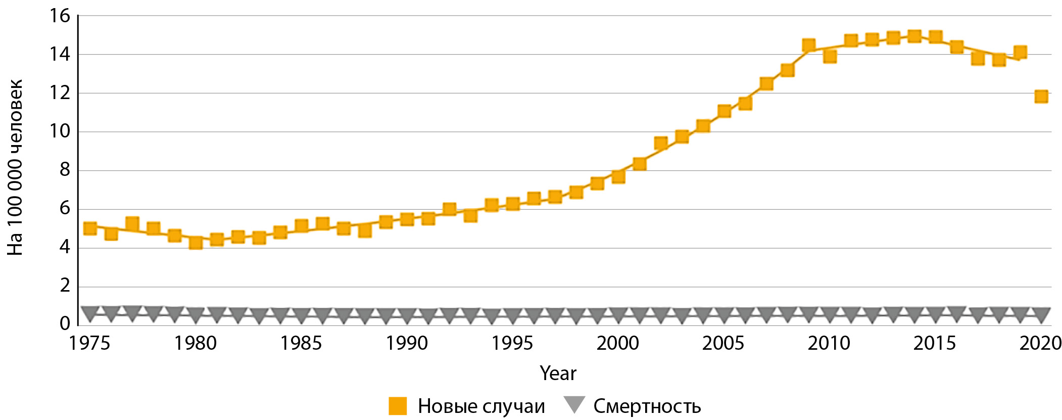 2. Рисунок 2. Рост распространенности РЩЖ (данные Национального института рака).