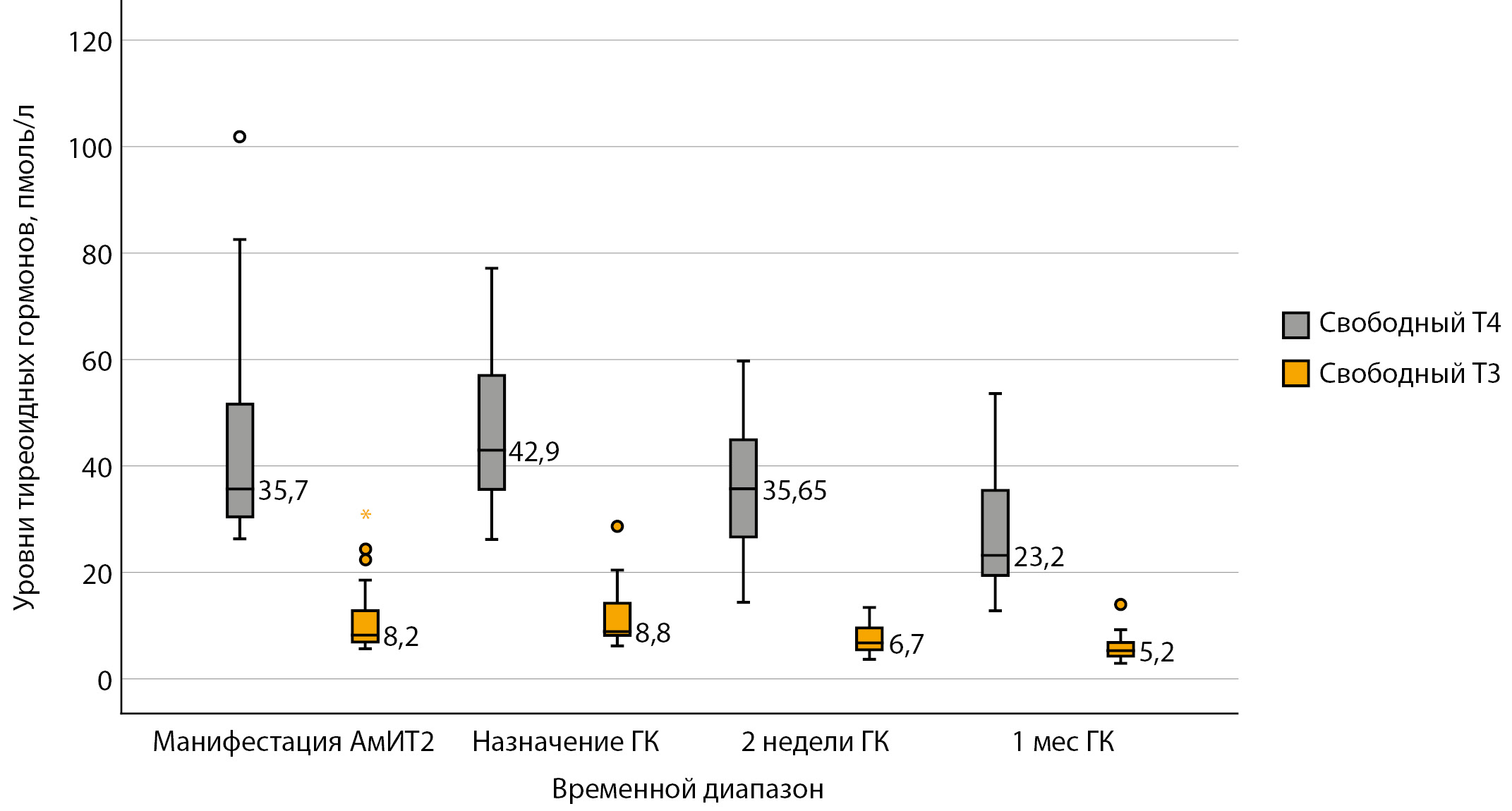 |  | 2. Рисунок 2. Динамика уровня свободных фракций тиреоидных гормонов на фоне терапии глюкокортикоидами. | |