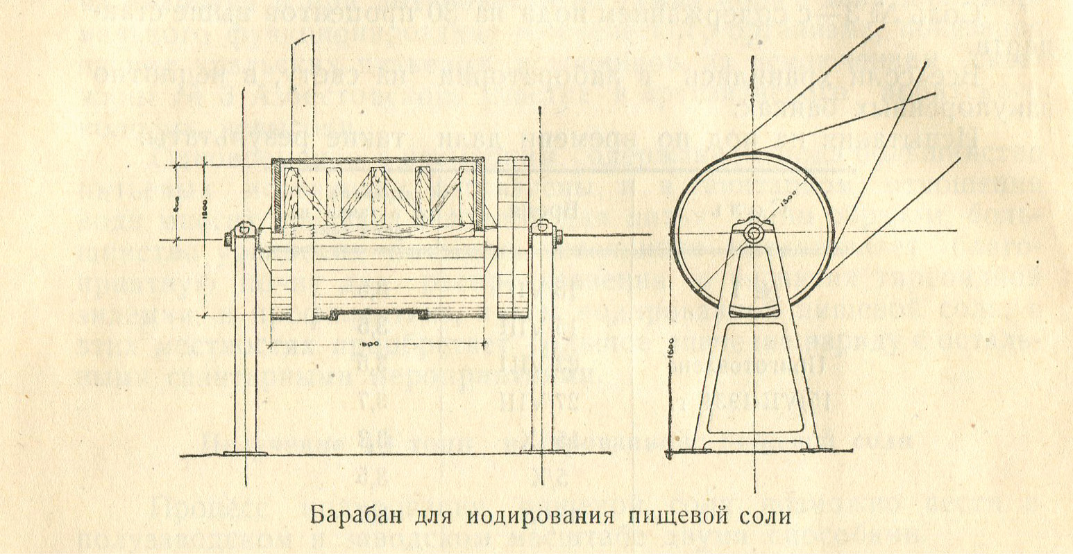 6. Рисунок 6. Эскиз аппарата для получения йодированной соли [11]. Пищевая соль загружается в деревянный (или железный) барабан, свободно вращающийся на деревянном или железном валу, находящемся внутри мешалки, установленном на железных козлах. Внутри барабана мешалка имеет косо срезанные на концах лопатки, укрепленные на валу в два ряда вертикально. Сквозной вал с перемешивающими лопатками приводится в движение отдельно в сторону противоположную вращению барабана. Размеры барабана на 500 кг пищевой соли единовременной загрузки: длина 1600 мм, внутренний диаметр 1200 мм, необходимая мощность мотора 4 лошадиной силы; количество оборотов барабана и мешалки - 15 в минуту. Процесс йодирования производится таким образом. Через загрузочное отверстие в середине барабана загружается 500 кг пищевой соли; при стоящем неподвижно барабане пускается в движение мешалка; водный раствор йодистого калия пульверизуется обыкновенным пульверизатором (или каким-либо другим распылителем); загрузочное отверстие закрывается, и барабан тоже приводится в движение. Раствор йодистого калия берется в количестве 5 литров (или 5 кг), т.е. 1% от количества йодируемой соли; берется 2 г йодистого калия на 5 л раствора, т.е. на 20% выше, чем требуется из расчета 0,0005% йодистого калия от количества йодируемой соли. Избыток йодистого калия необходим на покрытие потерь от впитывания стенками аппарата и от частичного распыления вне аппарата при пульверизации. Производительность аппарата примерно 4 тонны за 8 часов работы при единовременной переработке 500 кг соли. Загрузка занимает 10 минут, пульверизация йодистого калия – 10 мин, перемешивание – 30 минут, разгрузка 10 – минут. Для разгрузки барабан ставится отверстием вниз над воронкой; вращающаяся мешалка пригребает соль с концов барабана к середине и выгружает соль через воронку в вагонетку.