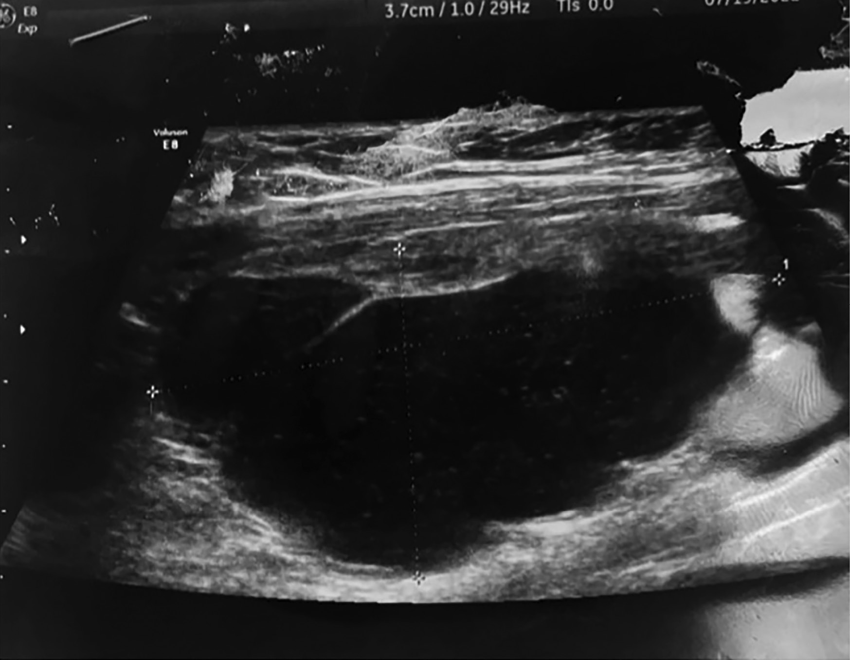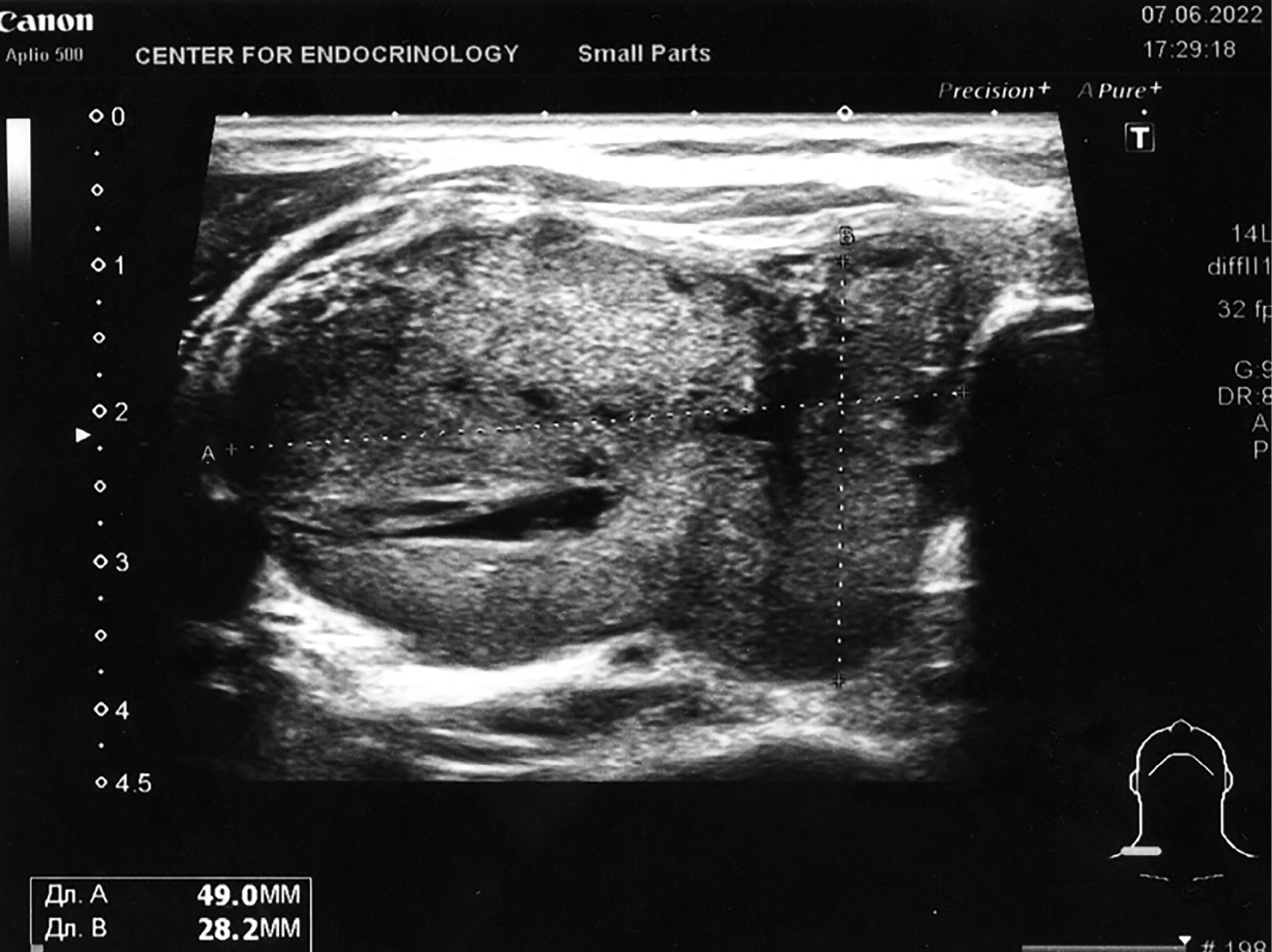3. Рисунок 3. Ультрасонограмма ЩЖ. В левой доле ЩЖ визуализировано жидкостное новообразование с перегородками, густым содержимым, четкими ровными контурами. | |