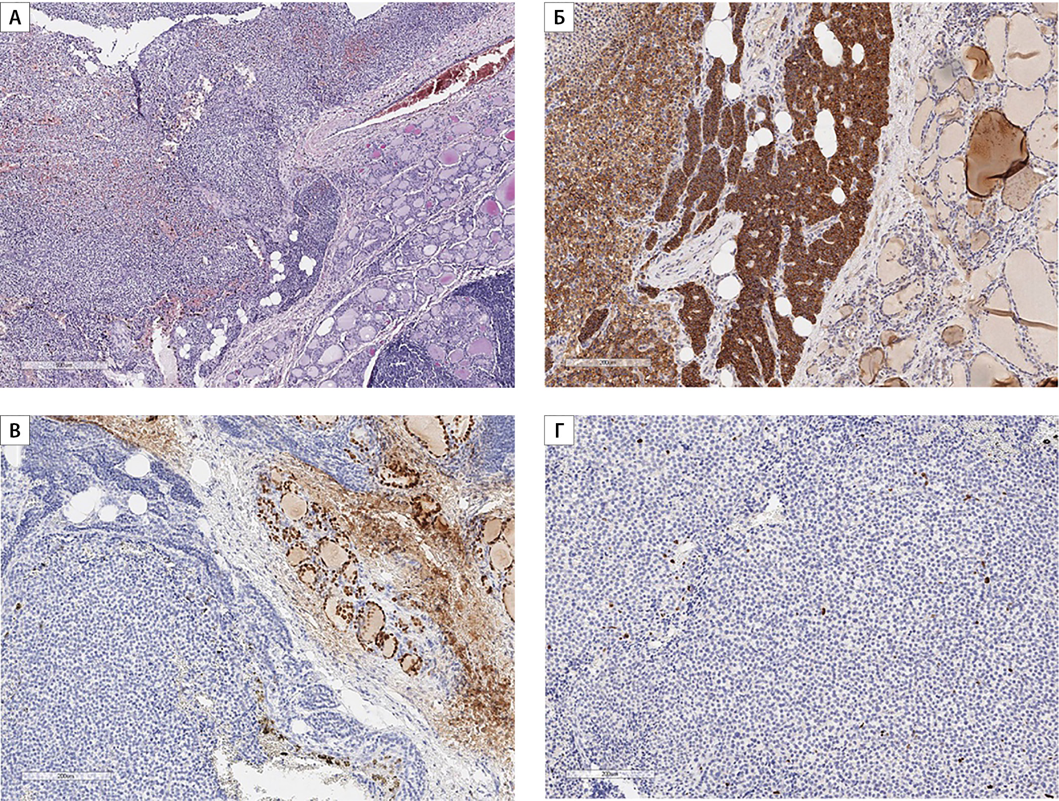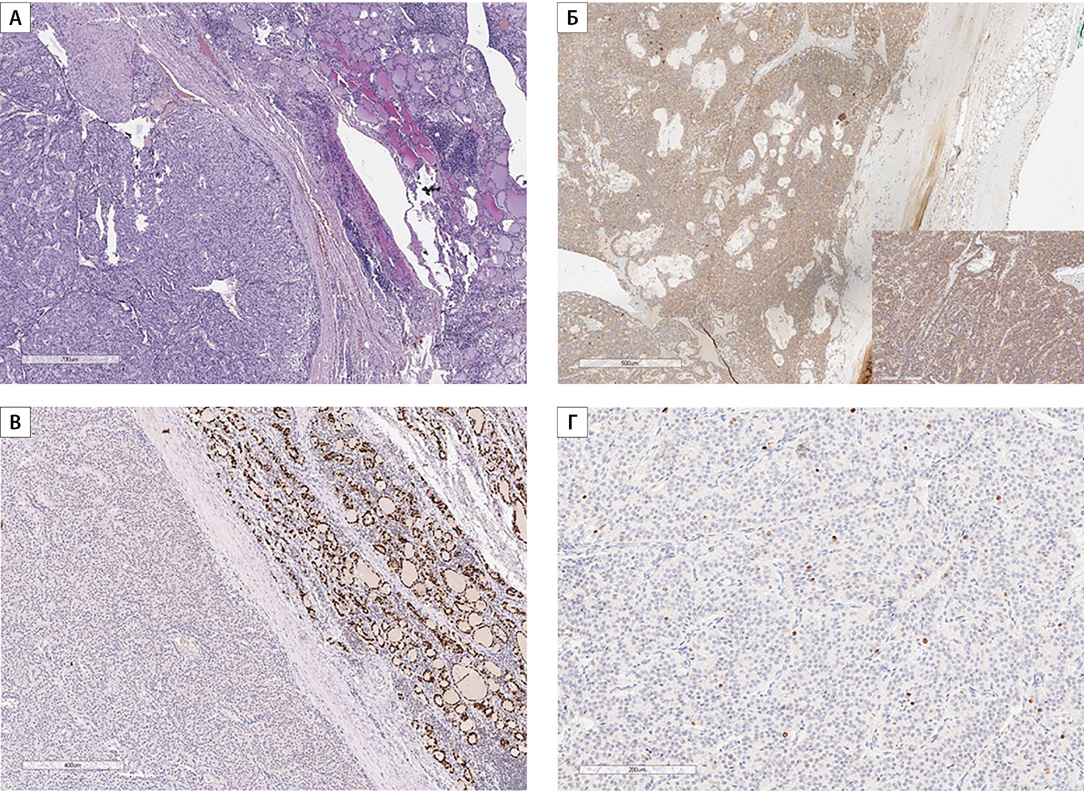 2. Рисунок 2. Гистограммы. Новообразование правой доли ЩЖ, представленное клетками с гиперхромными ядрами, участками фиброза, признаками инвазии широкой фиброзной капсулы и сосудов; тесно прилежащая ткань ЩЖ микронормофолликулярного строения с лимфоцитарной инфильтрацией, формированием немногочисленных лимфоидных фолликулов с центрами размножения (А). Отмечается диффузная экспрессия ПТГ и хромогранина А (Б). Отсутствует экспрессия TTF-1 (В). Индекс пролиферационной активности по ki67 в горячих точках максимально до 3% (Г). | |