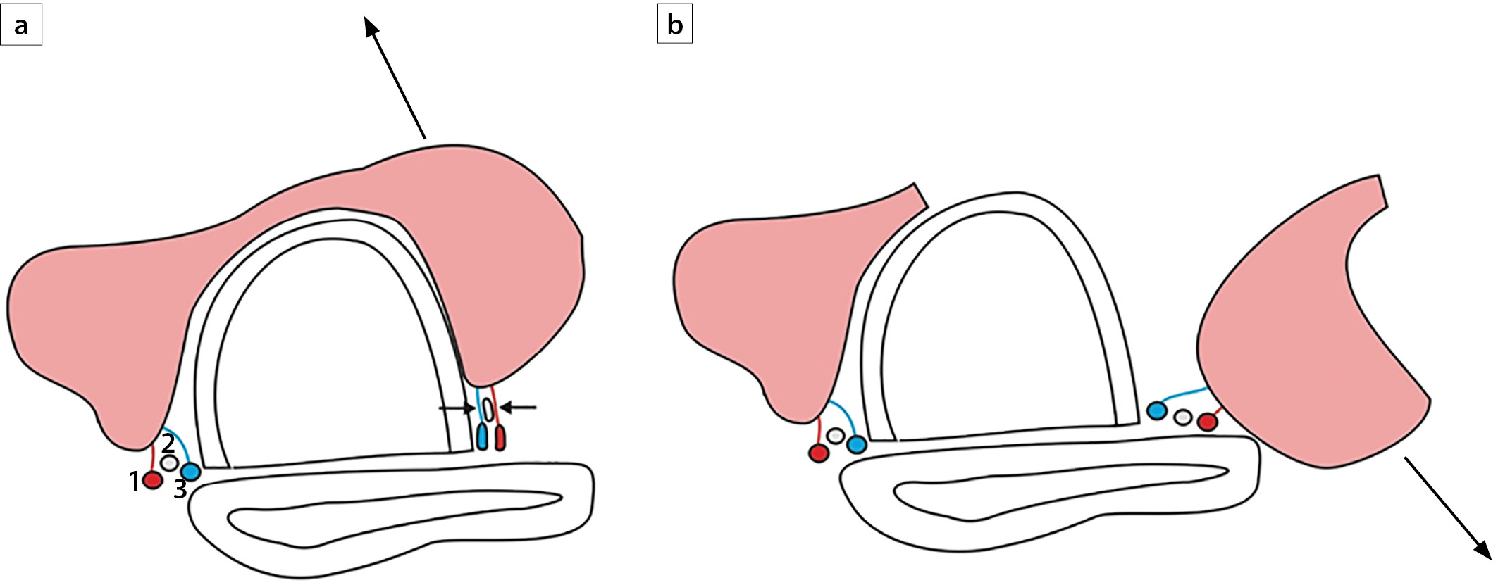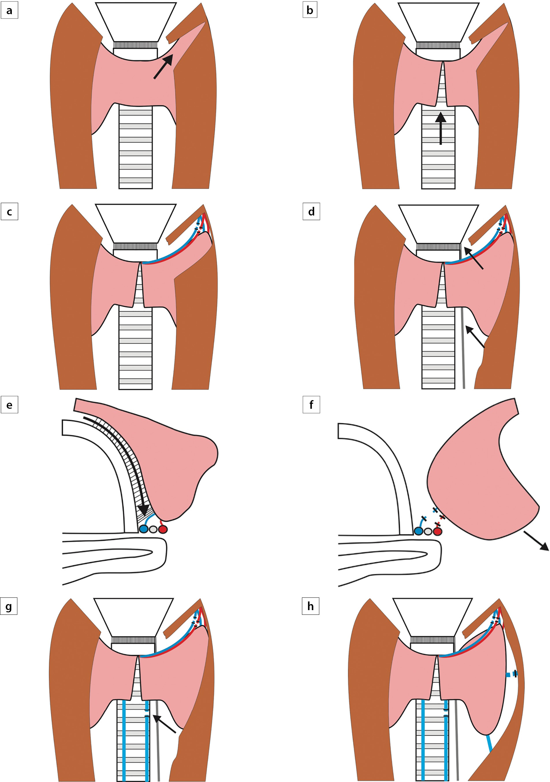 2. Рисунок 2. Механизм повреждения возвратного гортанного нерва сосудами в случае тракции доли щитовидной железы в медиально-верхнем направлении (а) и безопасная ситуация для нерва в случае тракции в латерально-нижнем направлении (b)