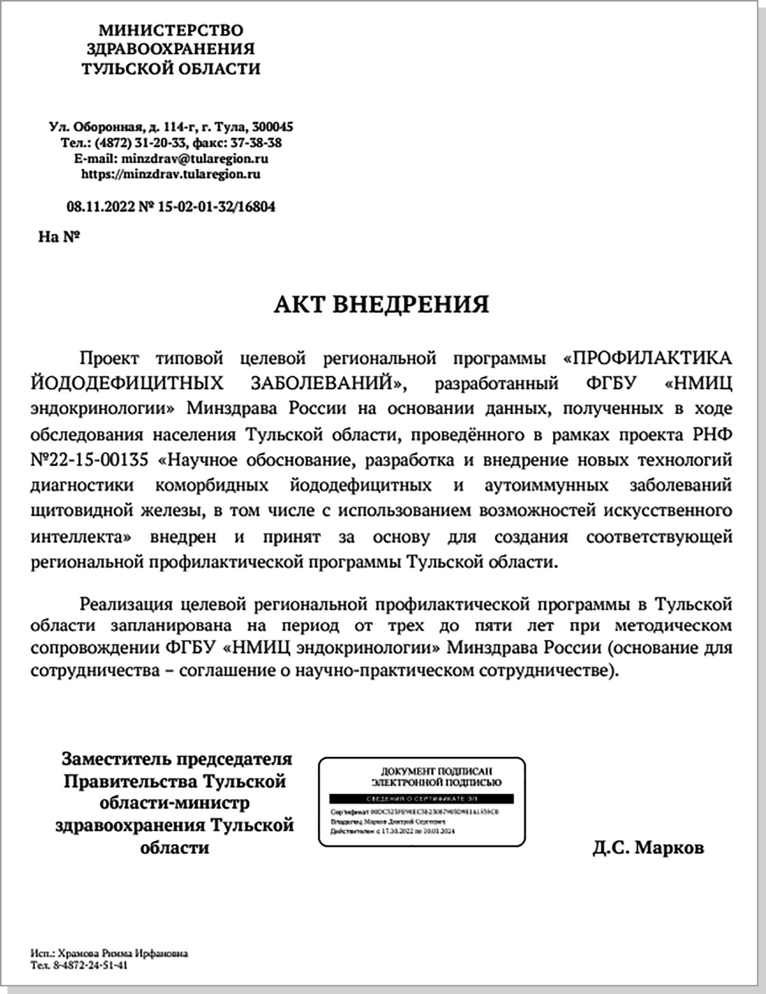 1. Рисунок 1. Акт внедрения проекта типовой целевой региональной программы «Профилактика йододефицитных заболеваний» в Тульской области.
