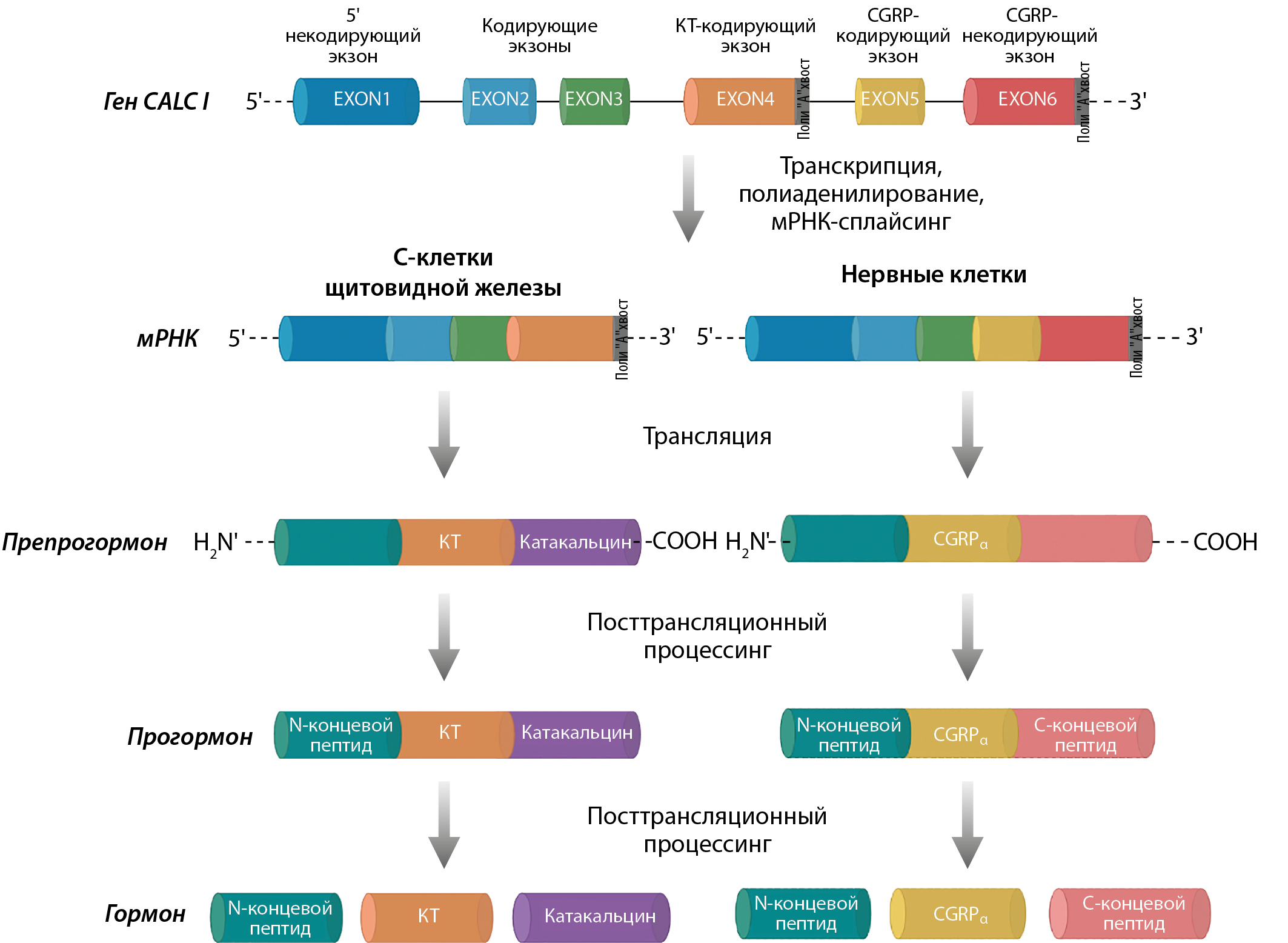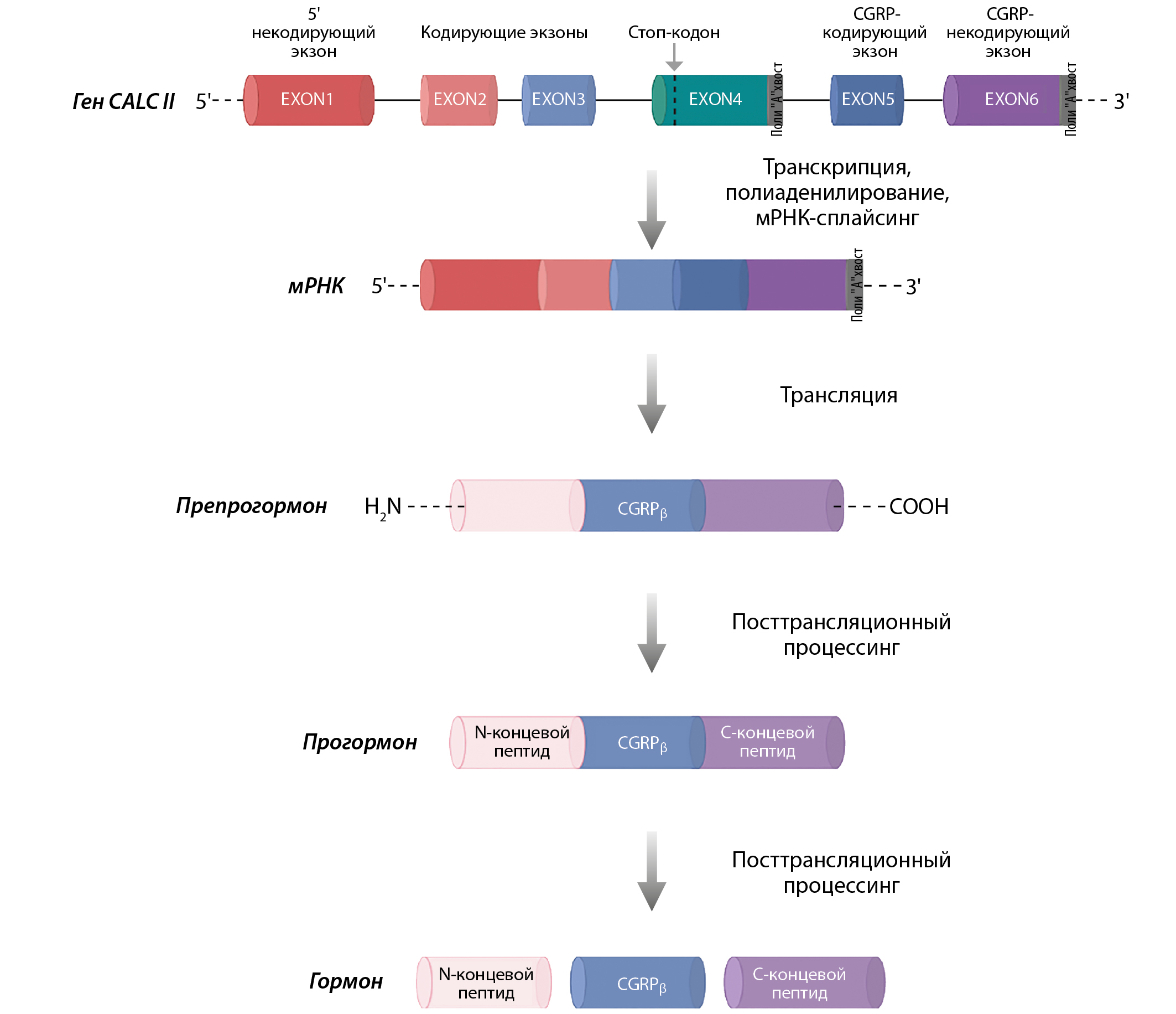 2. Рисунок 2. Биосинтез кальцитонин ген-ассоциированного пептида β (CGRPβ) на матрице гена CALC II. CGRPβ — кальцитонин ген-ассоциированный пептид; КТ-кальцитонин. Изображение создано в программе Biorender.com.