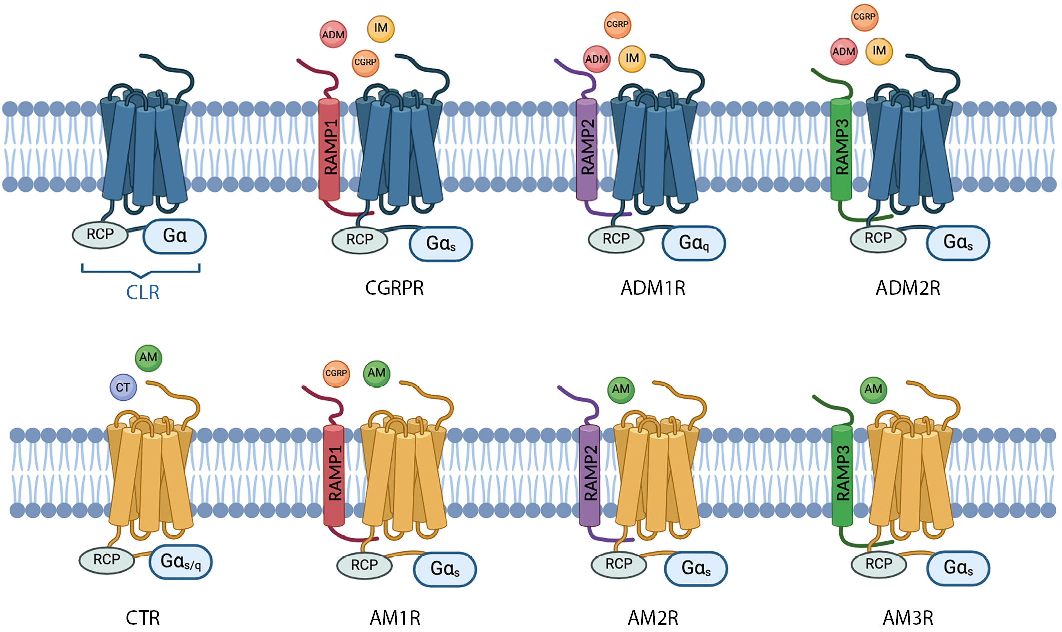 3. Рисунок 3. Рецепторы семейства кальцитонина, лиганды и их аффинность. Лиганды (пептидные гормоны) обозначены сферами (близость к рецептору демонстрирует их относительную силу воздействия — чем ближе к сайту связывания рецептора, тем больше аффинность). ADM — адреномедуллин; AD1MR — рецептор адреномедуллина-1; AD1MR — рецептор адреномедуллина-2 (интермедина); AM — амилин; AM1R — рецептор амилина-1; AM2R — рецептор амилина-2; AM3R — рецептор амилина-3; CGRP — кальцитонин ген-ассоциированный пептид; CGRPR — рецептор кальцитонин ген-ассоциированного пептида; CLR — рецептор, подобный рецептору кальцитонина; СT — кальцитонин; CTR — рецептор кальцитонина; Gα — альфа субъединица G-белка; RAMP1, 2, 3 — трансмембранные белки, относящиеся к семейству RAMP 1, 2, 3 типа; RCP — рецептор-связанный белое (receptor coupling protein). Изображение создано в программе Biorender.com.