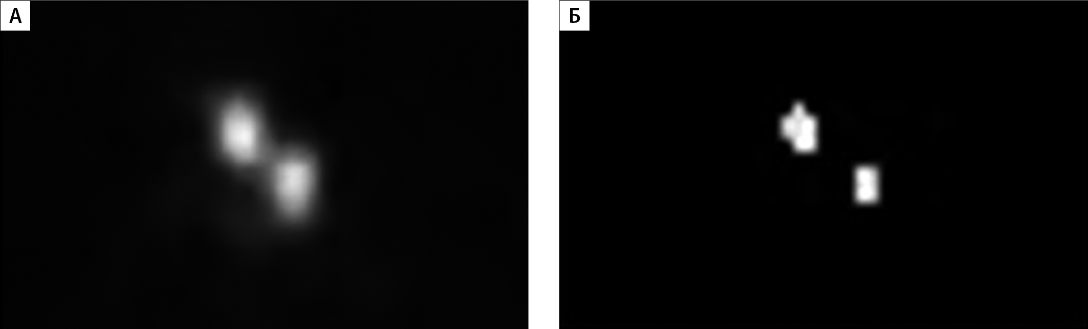 1. Рисунок 1. Срез ОФЭКТ/КТ исходного распределения (А) и маски (Б).