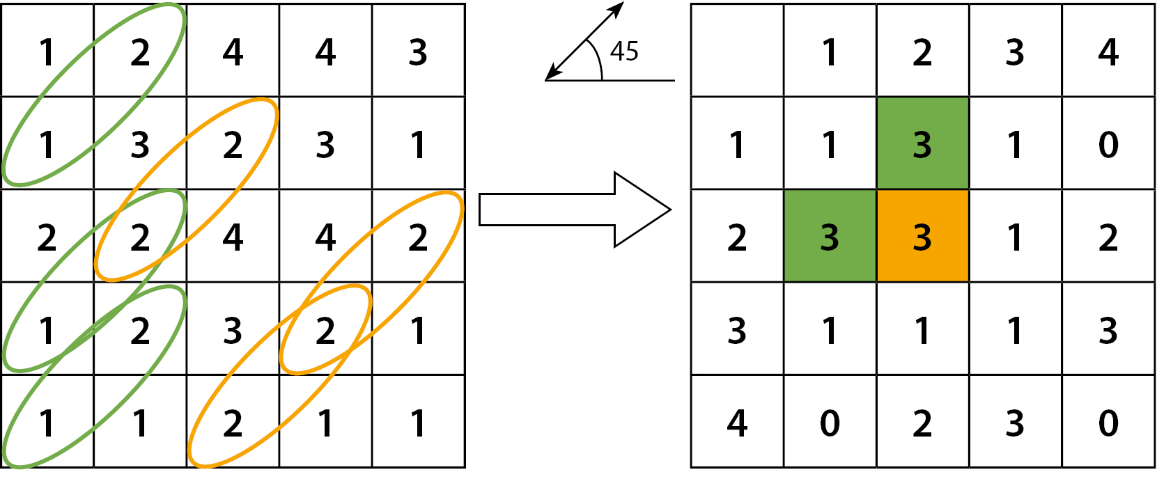 3. Рисунок 3. Пример построения матрицы частотности уровней серого (англ. GLCM) на основании исходного двумерного распределения, соседства вокселей под углом 45 градусов.