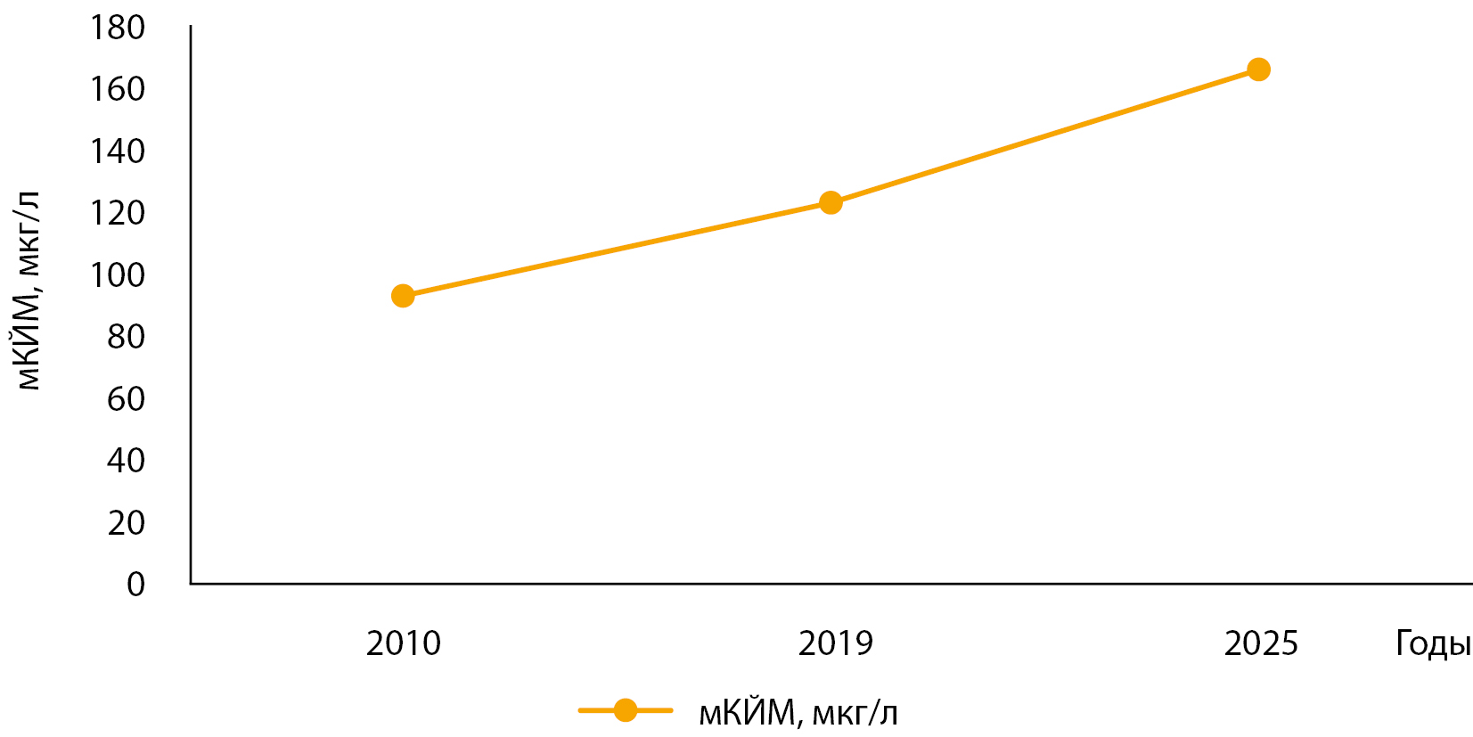 3. Рисунок 3. Динамика медианы концентрации йода в моче (мкг/л) у подростков г. Новосибирска по результатам мониторинга йододефицитных заболеваний с 2010 по 2025 гг.