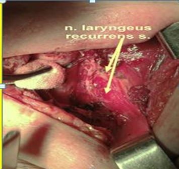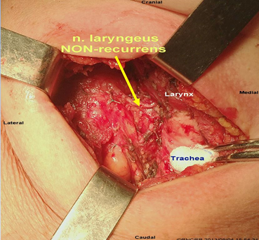 Анатомическое расположение НВГН значительно увеличивает риск его ятрогенного повреждения при выполнении тиреоидэктомии. Возможна травма нерва при выполнении тракции щитовидной железы и трахеи; во время лимфодиссекции; также нерв может быть ошибочно принят за сосуд, при этом перевязан или сожжен. Анализ литературных данных показывает высокую чувствительность компьютерной томографии для выявления сосудистой аномалии у больных, что в какой-то мере может служить предоперационным методом диагностики ННГН. Однако редкость встречаемости такой анатомической особенности не дает возможности рекомендовать метод как обязательный в предоперационном обследовании. Но при назначении этого обследования по другим показаниям в обязательном порядке должны быть изучены варианты кровоснабжения и топическая анатомия крупных сосудов, в частности подключичных и сонных артерий. Некоторые авторы сообщают о пользе проведения ультразвукового триплексного сканирования сосудов головы и шеи, при этом отмечая, что визуализация этих аномалий очень трудна и зависит от уровня подготовки специалиста. И поэтому, к сожалению, единственным достоверным методом выявления невозвратного нерва остается интраоперационный. Надо отметить, что, несмотря на многочисленные рекомендации начинать поиски невозвратного гортанного нерва только после неудачной попытки обнаружения возвратного гортанного нерва в типичном для него месте, мы придерживаемся мнения тех авторов, которые рекомендуют в каждом случае идентифицировать все структуры зоны медиальнее сонной артерии до доли щитовидной железы (так называемый transversus path – поперечный путь). Особое внимание стоит уделять области нижней щитовидной артерии и медиальной вены щитовидной железы.