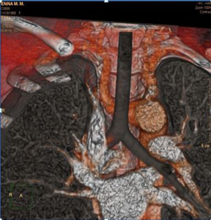 Рис. 3. Результаты компьютерной томографии шеи и органов грудной клетки с ангиографией: а – аорта (вид сзади); б – предпозвоночное расположение правой подключичной артерии.