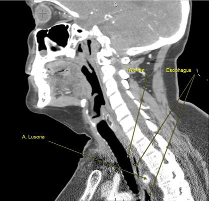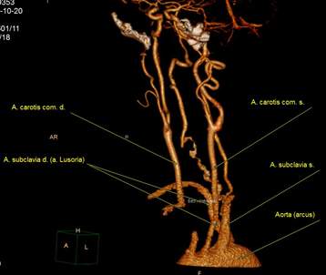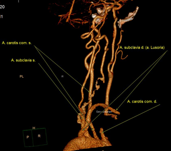 У пациентов, у которых наблюдаются аномалии развития подключичных артерий, нижний гортанный нерв отходит от блуждающего нерва на уровне гортани – невозвратный нижний гортанный нерв (ННГН). Первое упоминание о ННГН датируется 1823 г., когда патологоанатом Д.В. Стедман описал случай аутопсии, где правый нижний гортанный нерв отходил от блуждающего нерва на уровне гортани [4]. Также в записях было описание аномалии отхождения правой подключичной артерии. Последняя отходила от дуги аорты слева отдельным стволом. Первый описанный случай аномалии подключичной артерии датируется более ранним периодом. Бейфорд в 1787 г. опубликовал случай дисфагии, обусловленный сдавлением пищевода аномальной правой подключичной артерией, назвав ее дисфагией люзория (lusoria – от латинского lusus nature – игры природы, загадки природы) [5]. Эта аномалия сосудистой системы, по разным сообщениям, встречается у 0,5–2% населения [6]. Описаны три анатомических варианта расположения данной артерии: позади пищевода (85% наблюдений), между пищеводом и трахеей (10% случаев), впереди трахеи (5% случаев). В большинстве случаев клинические проявления отсутствуют, и только у 5–7% пациентов проявляются симптомы, которые могут возникать при сдавлении a. lusoria пищевода и трахеи, – дисфагия, боль в грудной клетке, затруднение дыхания. Чрезвычайно редко встречаются случаи, когда a. lusoria отходит от аневризматически расширенной дуги аорты, которая получила название «дивертикул Коммереля» [6–8].