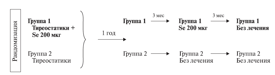 Исходно и каждые 3 мес наблюдения оценивались показатели: ТТГ, св.Т4, св.Т3, АТ-ТПО и АТ-рТТГ, также проводилось УЗИ щитовидной железы, оценивались объем и эхогенность паренхимы ЩЖ. Период наблюдения составил 18 мес (12 мес терапии, 6 мес наблюдения после отмены тиреостатической терапии, Se отменялся после 15 мес наблюдения). Дизайн исследования представлен на рис. 1.