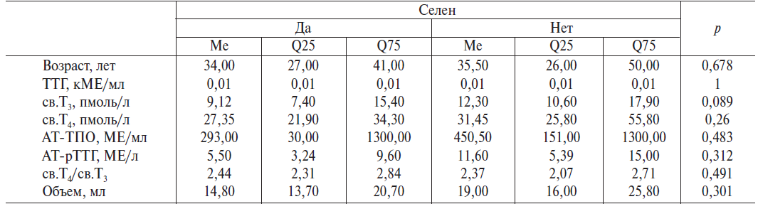 Исходно по показателям ТТГ, св.Т4, св.Т3, АТ-ТПО, АТ-рТТГ, объему ЩЖ по данным УЗИ пациентки двух групп между собой не отличались (р > 0,05) (табл. 1).