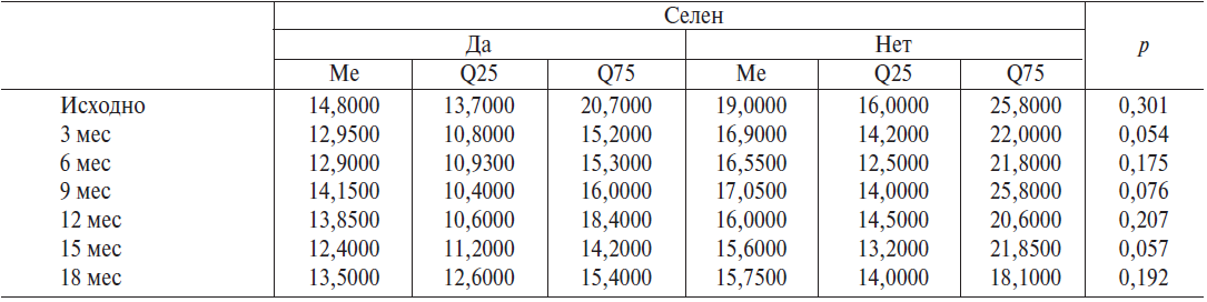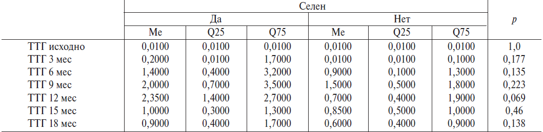 Выводы. Согласно данным нашего исследования, применение Se в фармакологических дозах (200 мкг в сутки) в рамках комплексной терапии БГ в течение 12 мес не приводило к статистически значимому эффекту в отношении клинических исходов БГ, а также не сопровождалось положительным “аутоиммунным” эффектом.