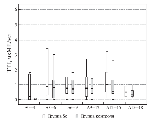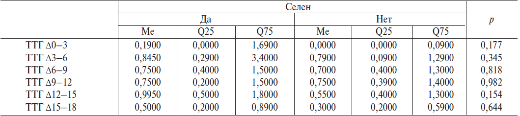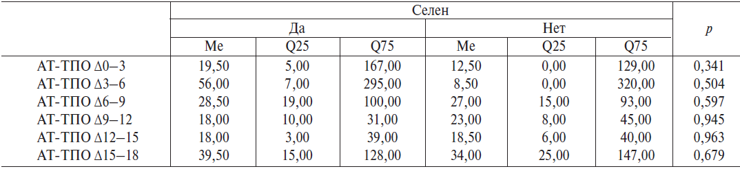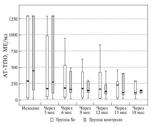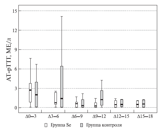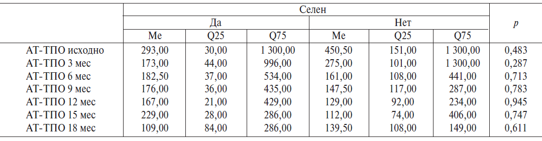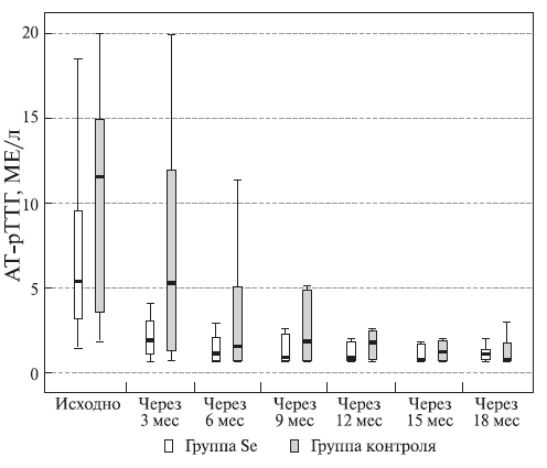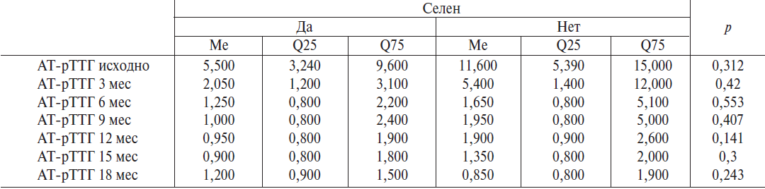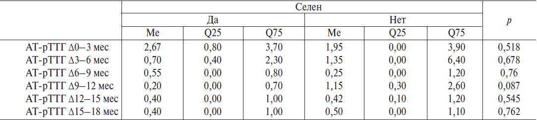 Данные нашего исследования совпадают с данными вышеописанных исследований в отношении отсутствия отличий в динамике антитиреоидных антител (АТ-рТТГ, АТ-ТПО) между группами терапии (Sе + тиреостатическая терапия vs тиреостатическая терапия).