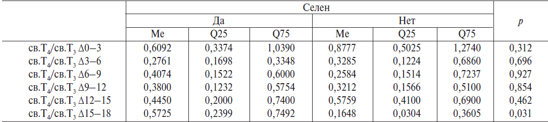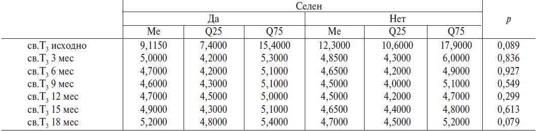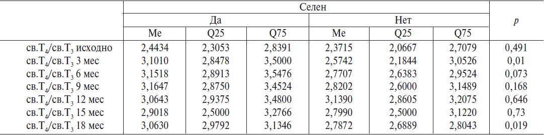 Таблица 9. Динамика показателей св.Т4/св.Т3 в течение 18 мес