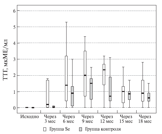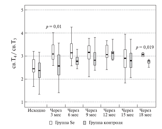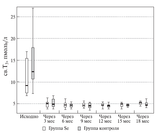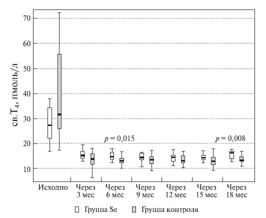 Совсем недавно были опубликованы результаты трехмесячного итальянского исследования, в котором исследовались краткосрочные эффекты Se на фоне консервативной терапии БГ [15]. В исследование были включены 30 пациентов с впервые выявленной БГ и исходно адекватной концентрацией Se в сыворотке крови (>100 нг/мл), которые были рандомизированы в две группы терапии: 1) метимазол + Se (в среднем 166 мкг/сут); 2) метимазол. В качестве первичных конечных точек через 90 дней терапии оценивались: контроль тиреотоксикоза (главным образом св.Т3 и св.Т4), клинические и другие биохимические признаки тиреотоксикоза (частота сердечных сокращений (ЧСС), масса тела, общий холестерин, глобулин, связывающий половые гормоны (ГСПГ), шкала оценки симптомов тиреотоксикоза). В качестве вторичных конечных точек оценивались: контроль тиреотоксикоза, а также клинические и другие биохимические признаки тиреотоксикоза через 45 дней терапии; концентрация Se в сыворотке крови, малондиальдегида, показатели окислительного стресса; нежелательные явления на фоне приема Se через 45 и 90 дней терапии. Как через 45, так и через 90 дней терапии не отмечалось статистически достоверных отличий между группами по динамике компенсации тиреотоксикоза (св.Т3 и св.Т4, ТТГ), уровней АТ-рТТГ, ЧСС, массы тела, ГСПГ, общего холестерина, малондиальдегида. В группе пациентов, принимавших Se, отмечалось увеличение концентрации Se в сыворотке крови, которое сохранялось на достоверно более высоком уровне в течение 90 дней терапии.