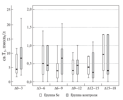 К 3-му месяцу терапии 14/14 (100%) пациенток группы Se и 13/14 (93%) пациенток из контрольной группы были компенсированы на фоне проводимой терапии. У 1/14 (7%) пациентки из контрольной группы сохранялся манифестный тиреотоксикоз по причине нерегулярного, от случая к случаю, приема тиреостатических препаратов. На протяжении всего периода наблюдения не выявлено достоверно значимых отличий динамики показателей ТТГ, св.Т3 (табл. 3–6; рис. 2–5), также не отмечалось статистических различий в динамике разницы изменений указанных показателей (трехмесячные интервалы) – D; пациентки обеих групп с одинаковой скоростью достигали показателей эутиреоза.