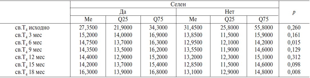 Таблица 7. Динамика показателей св.Т4 в течение 18 мес