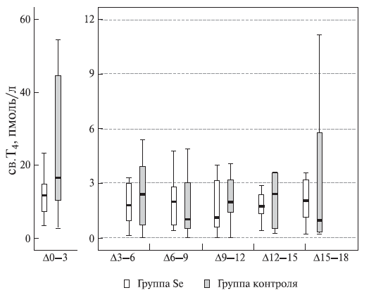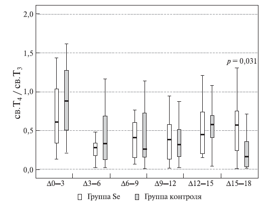 При оценке динамики показателя св.Т4 (табл. 7; рис. 6) были выявлены статистически значимые отличия между группами на 6-м и 18-м месяцах наблюдения, при этом не отмечалось статистически значимых отличий между группами при анализе Dсв.Т4 в течение 18 мес. наблюдения (табл. 8; рис. 7). На этих сроках показатель св.Т4 был достоверно выше в группе Se в сравнении с контрольной группой: на 6-м месяце 14,75 [13,7; 16,3] и 12,95 [12,1; 14,2] пмоль/л (р = 0,015), на 18-м месяце 16,3 [13,9; 16,8] и 13,1 [12,9; 14,8] пмоль/л (р = 0,008) соответственно. Подобные отличия были получены и при определении отношения показателей св.Т4/св.Т3 (табл. 9; рис. 8), а также при анализе динамики разницы изменений отношения св.Т4/св.Т3 (табл. 10; рис. 9). В группе Se на 3-м и 18-м месяцах наблюдения отношение св.Т4/св.Т3 было достоверно выше, чем в контрольной группе: на 3-м месяце 3,10 [2,85; 3,5] и 2,57 [2,18; 3,05] (р = 0,01), на 18-м месяце 3,06 [2,98; 3,13] и 2,79 [2,69; 2,80] (р = 0,019) соответственно, а Dсв.Т4/св.Т3 достоверно выше в группе Se в сравнении с контрольной группой при анализе разницы в период между 15-м и 18-м месяцами наблюдения: 0,57 [0,24; 0,75] и 0,16 [0,03; 0,36] соответственно. Тенденция к большим значениям св.Т4 и отношения св.Т4/св.Т3 в группе Se в сравнении с группой контроля отмечена на разных сроках терапии, однако статистической достоверности отличия достигли лишь в указанные сроки.
