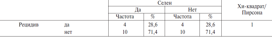 Всего на момент окончания периода наблюдения было выявлено 4 рецидива БГ: 2 в группе терапии Se и 2 случая в контрольной группе. Средний срок развития рецидива составил 3,25 (1,0; 6,0) в обеих исследуемых группах. Статистически значимой разницы в частоте и сроках развития рецидива между группами не получено (табл. 18, 19).